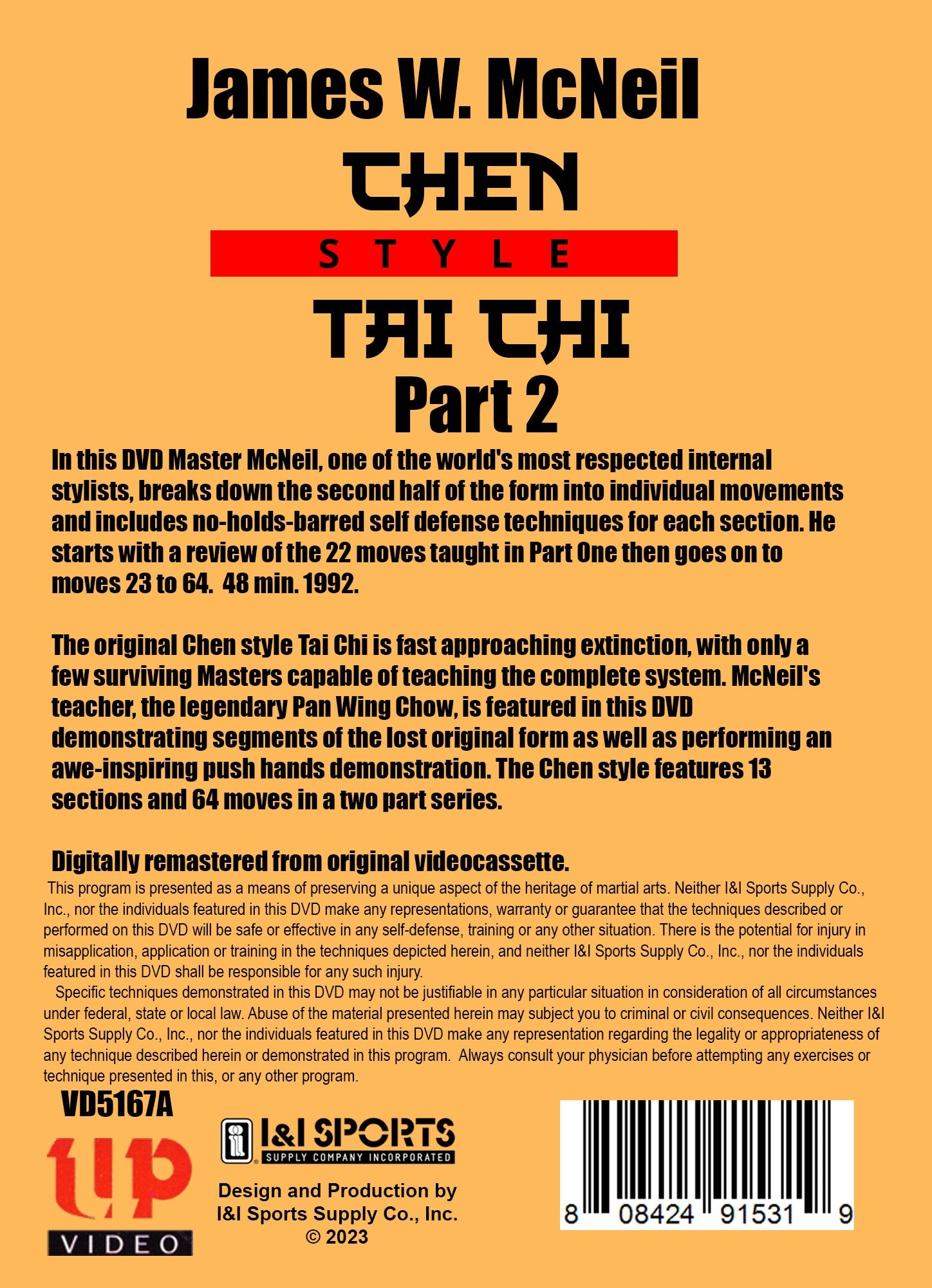 The original Chen style Tai Chi is fast approaching extinction, with only a few surviving Masters capable of teaching the complete system. McNeil's teacher, the legendary Pan Wing Chow, is featured in these DVDs demonstrating segments of the lost original form as well as performing an awe-inspiring push hands demonstration. The Chen style features 13 sections and 64 moves in a two part series.