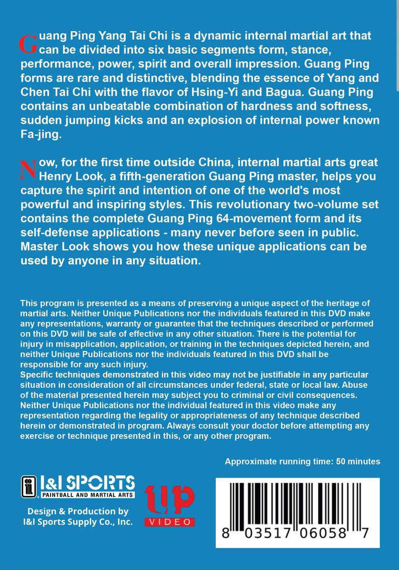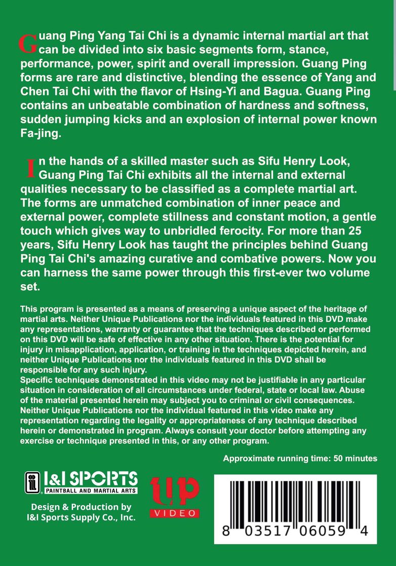 Sifu Look, fifth generation Guang Ping master, helps you capture the spirit and intention of one of the world's most powerful and most complete martial arts in existence today. Guan Ping Yang Tai Chi is a dynamic internal martial art that can be divided into six basic segments: form, stance, performance, power, spirit and overall impression. Guang Ping forms are rare and distinctive, blending the essence of Yang and Chen Tai Chi with the flavor of Hsing-Yi and Bagua. Introduced into the US by Professor Kuo Lien-Ying, this dynamic internal martial art contains both hardness and softness, sudden jumping kicks, and an explosion of internal power known as Fa-Jing. Those who witness the style can easily see it is more combat oriented than other versions of Yang family taijiquan being taught today. For more than 25 years, Sifu Henry Look has taught the principles behind Guang Ping Tai Chi's amazing curative and combative powers. Now you can harness the same power through this first ever, two volume set.