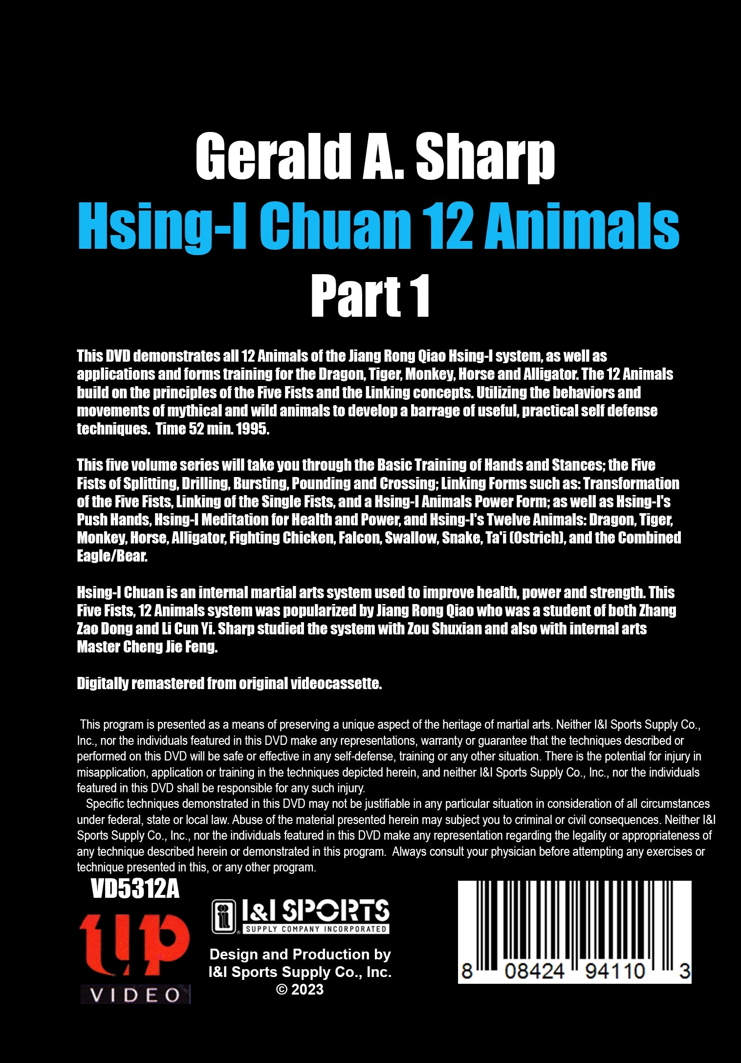 The 12 Animals build on the principles of the Five Fists and the Linking concepts. This series will take you through the Basic Training of Hands and Stances; the Five Fists of Splitting, Drilling, Bursting, Pounding and Crossing; Linking Fors such as: Transformation of the Five Fists, Linking of the Single Fists, and a Hsing-I Animals Power Form, as well as Hsing-I's Push Hands, Hsing-I Meditation for Health and Power, and Hsing-I's Twelve Animals: Dragon, Tiger, Monkey, Horse, Alligator, Fighting Chicken, Falcon, Swallow, Snake, Ta'i (Ostrich), and the Combined Eagle/Bear. 1995