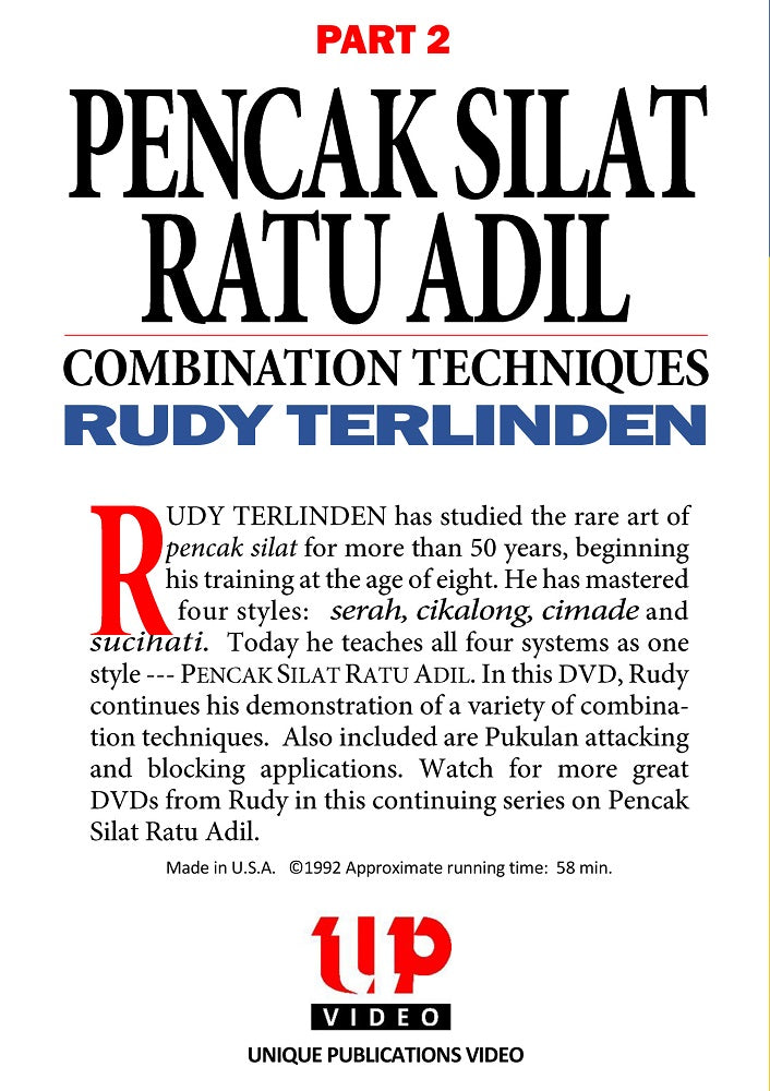 Rudy Terlinden studied for more than 50 years to master four styles: Serah; Cikalong; Cimade and Suci-Hati. He combined these four styles to create Pencak Silat Ratu Adil. Rudy demonstrates Juru (form) number one and teaches techniques based on this form. 1992 Part 1: You'll learn footwork to positon you to apply counterattacks and effortless takedowns. Included are the forms Pukulan number one and two plus a variety of self-defense techniques. 58 min. Part 2: In this DVD, Rody continues his demonstration of a variety of combination techniques. Also included are Pukulan attacking and blocking applications. 58 min.