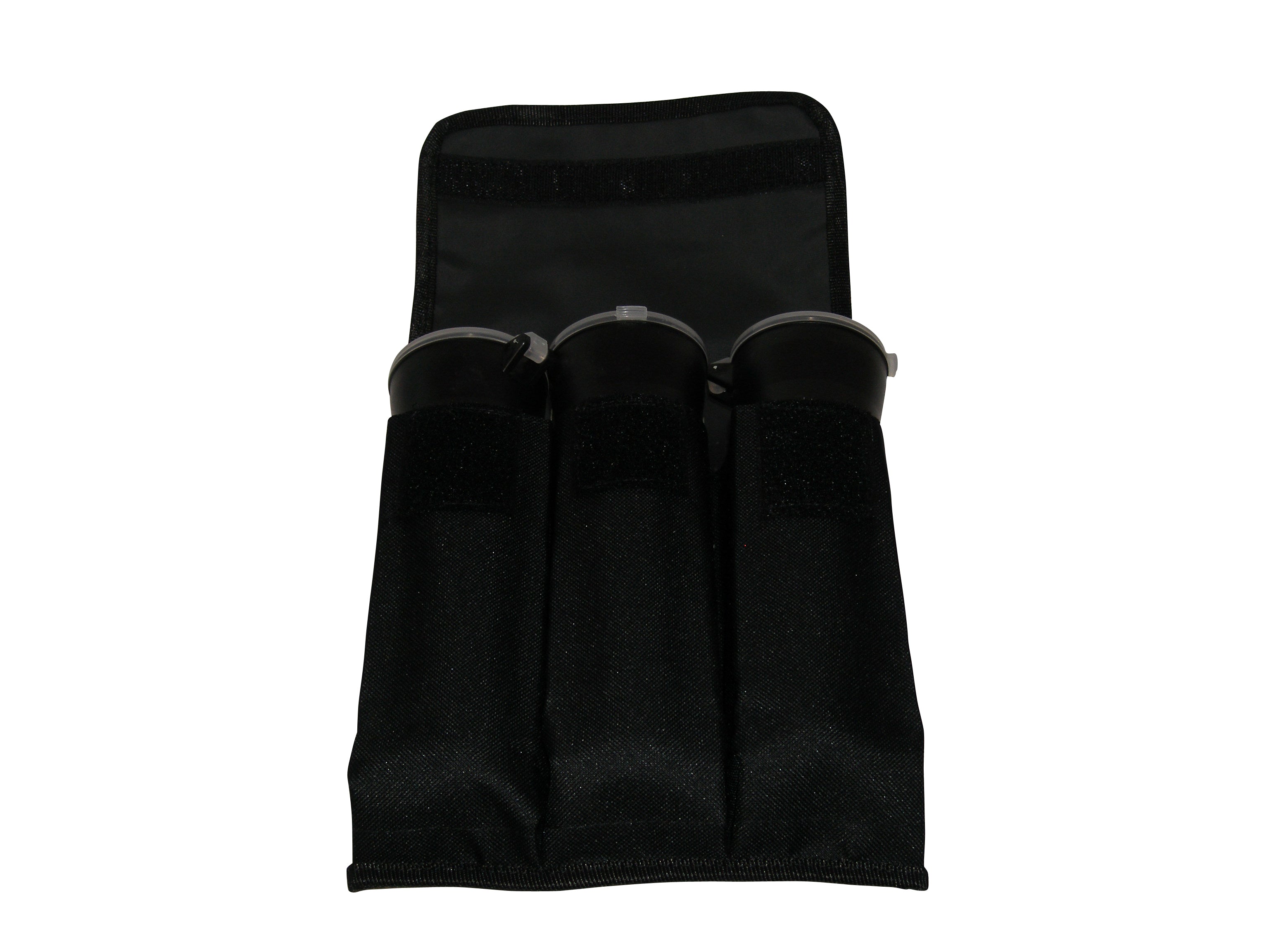 Black triple Paintball pod pouch holds three 100 round flip-top tubes (NOT included). Constructed of heavy; stain-resistant black polyester webbing. Three separate pouches with 1 hook & loop flap and reinforced stitching throughout. Fits on any web belt.