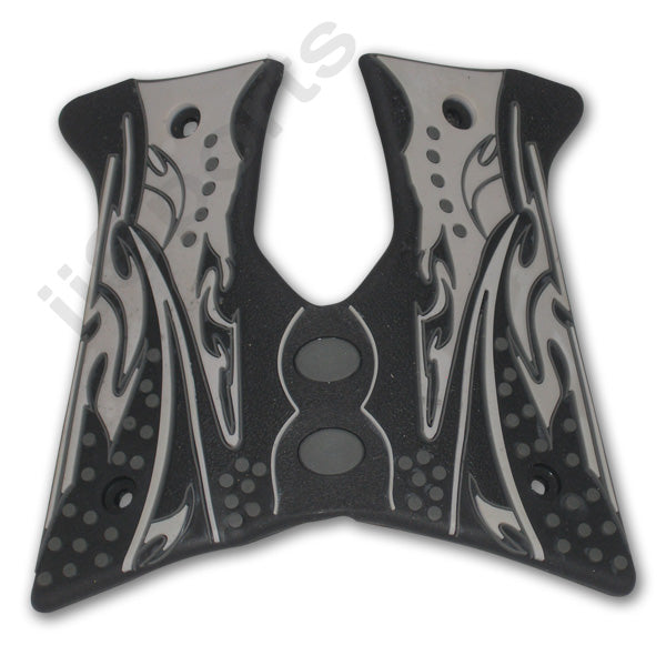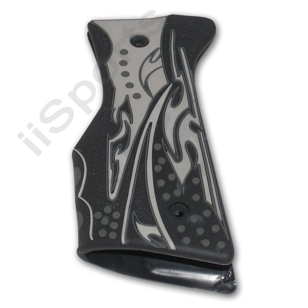 Rubber style wrap-around grips fit any Paintball marker with standard 45 trigger frame (i.e. Tippmann 98; mechanical Spyders including the Classic; Sonix; Victor; TL; eSpirit; Rodeo; Aggressor; etc. Most mechanical Viewloader; JT and Brass Eagle markers; BT markers and Spyder clones). These wrap around grips feature a textured finish with cool contrasting color graphics which provides the perfect blend of good looks and a positive grip. Finger grooved for maximum comfort. Custom looks and a great feel! 2 screw per side design (screws not included). Black & Gray.