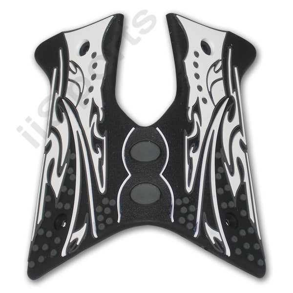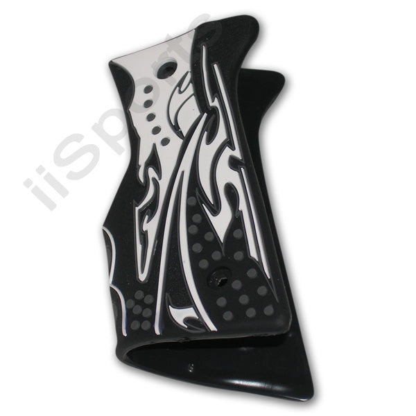 Rubber style wrap-around grips fit any Paintball marker with standard 45 trigger frame (i.e. Tippmann 98; mechanical Spyders including the Classic; Sonix; Victor; TL; eSpirit; Rodeo; Aggressor; etc. Most mechanical Viewloader; JT and Brass Eagle markers; BT markers and Spyder clones). These wrap around grips feature a textured finish with cool contrasting color graphics which provides the perfect blend of good looks and a positive grip. Finger grooved for maximum comfort. Custom looks and a great feel! 2 screw per side design (screws not included). Black & White.