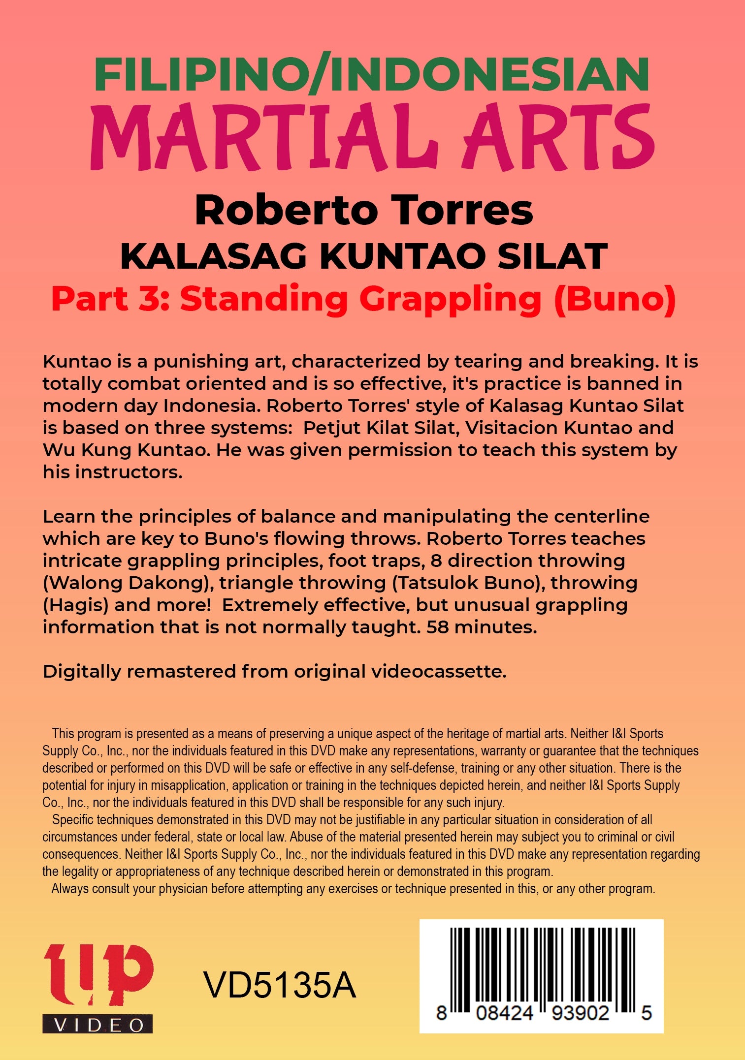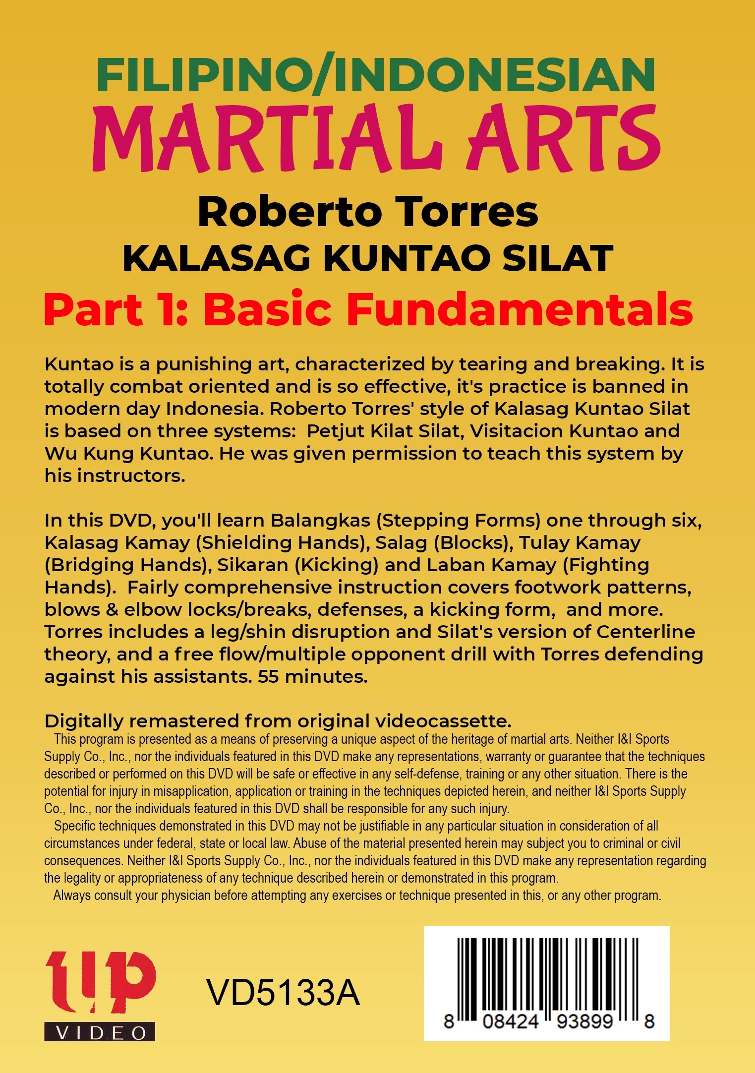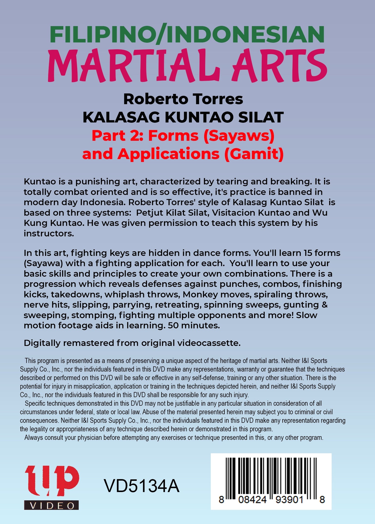 Kuntao is a punishing art, characterized by tearing and breaking. It is totally combat oriented and is so effective, it's practice is banned in modern day Indonesia. Roberto Torres' style of Kalasag Kuntao Silat is based on three systems: Petjut Kilat Silat, Visitacion Kuntao and Wu Kung Kuntao. He was given permission to teach this system by his instructors.