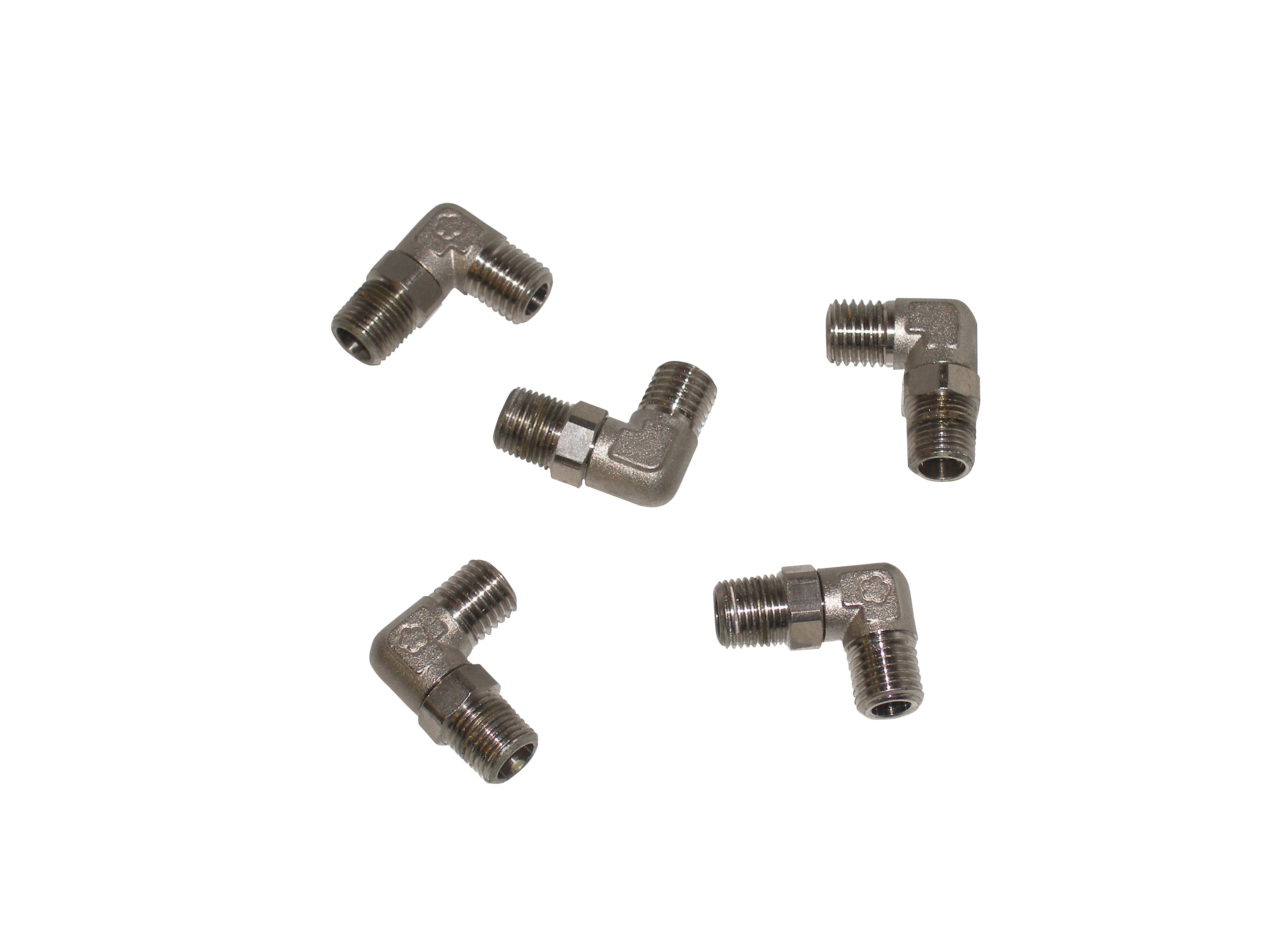 FIVE (5) swivel elbows. These are 'Spyder' 90 degree elbows with an 1/8" NPT male and a Metric male end. Steel construction features a design which allows it to swivel, even while pressurized.