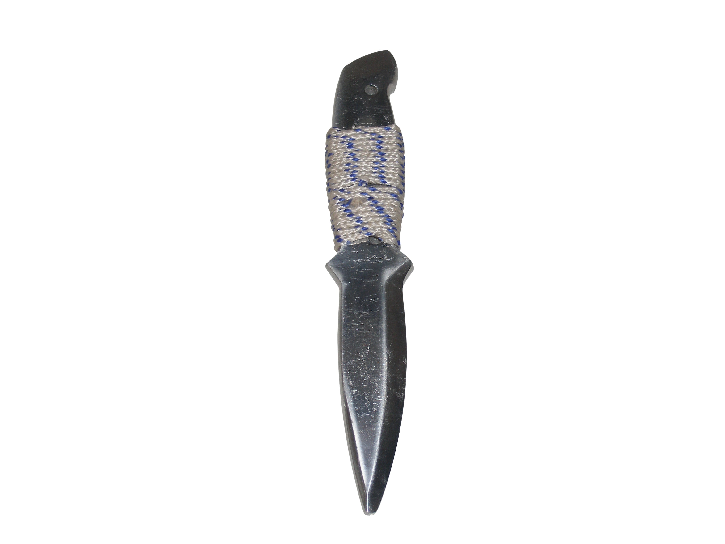 High quality solid aluminum training knife. The 4" blade is extra thick (can be easily covered in chalk for marking cutting points) and tapered for a more realistic feel. The handle is wrapped in nylon cord to provides a secure grip for performing the most rigorous training drills. No cut out holes for a heavier feel. Will not cut flesh. Overall 8" x 1.25" x .25"; .30 lbs.