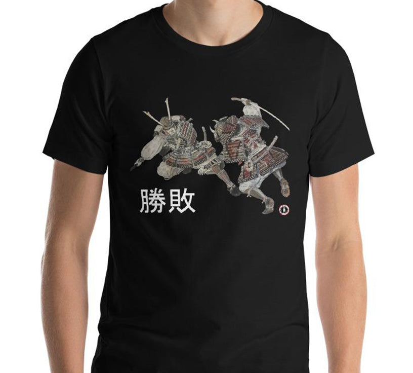 Designed by noted Artist - Hideo Sei! This original pen & ink artwork depicts a classic battle between the Samurai Sword and Naginata. Fine 10-color design with kanji is precision printed on a black premium cotton/poly blend T-shirt. Printed on the front of the shirt. Lightweight classic fit, double-needle sleeve and bottom hem Great casual wear! Adult sizes. Made in USA.