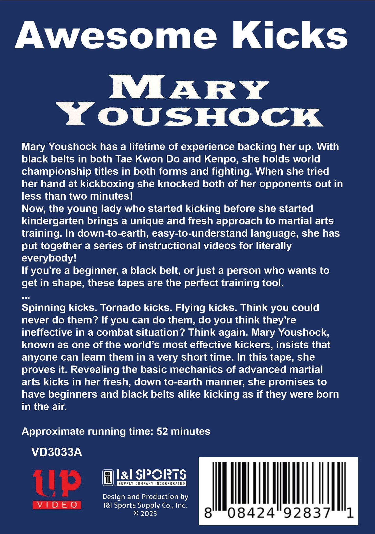 Mary Youshock has a lifetime of experience backing her up. With black belts in both Tae Kwon Do and Kenpo, she holds world championship titles in both forms and fighting. When she tried her hand at kickboxing she knocked both of her opponents out in less than two minutes! Now, the young lady who started kicking before she started kindergarten brings a unique and fresh approach to martial arts training. In easy-to-understand language, she has put together a series of instructional DVDs for literally everybody! Spinning kicks. Tornado kicks. Flying kicks. Mary Youshock, known as one of the world's most effective kickers, insists that anyone can learn them in a very short time. In this DVD, she proves it. Revealing the basic mechanics of advanced martial arts kicks in her fresh, down to-earth manner, she promises to have beginners and black belts alike kicking as if they were born in the air. 52 minutes.