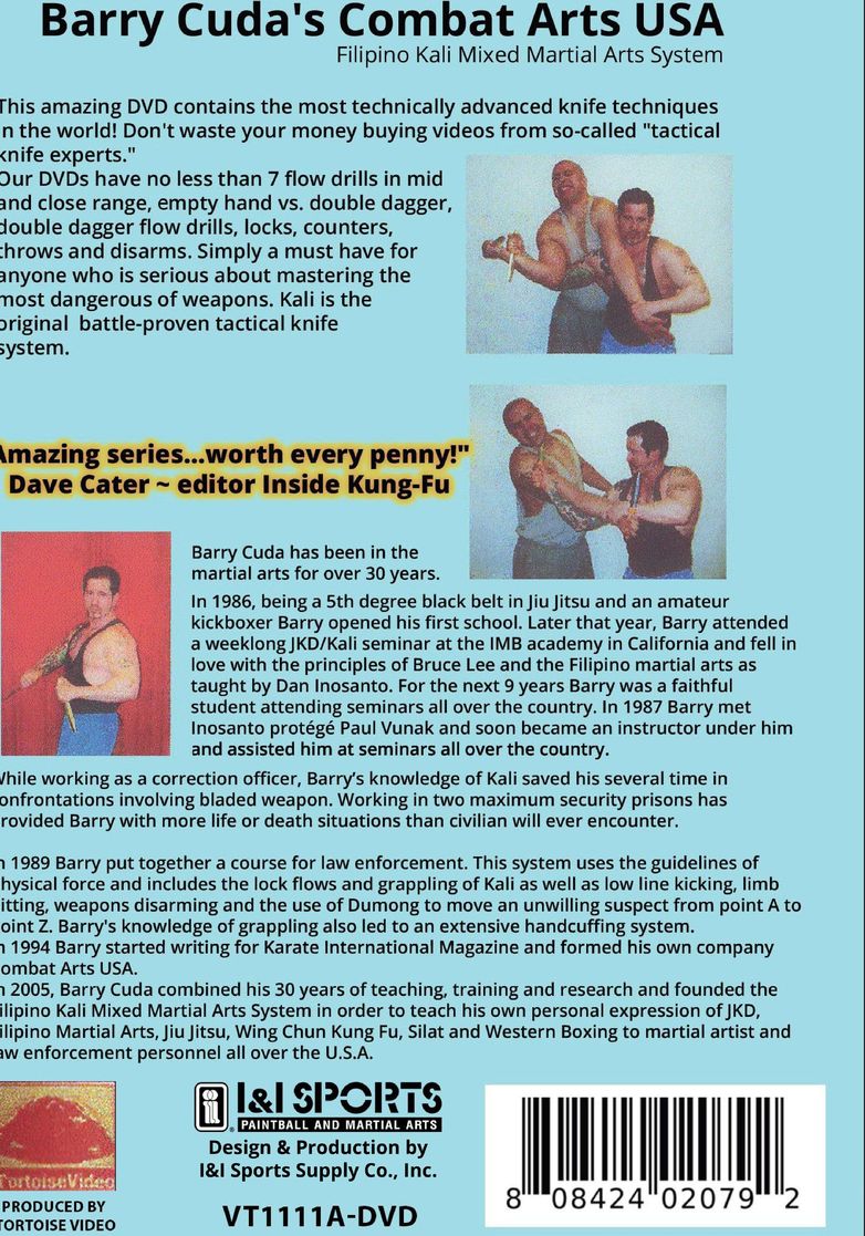 Features the most technically advanced knife techniques in the world! Features 7 flow drills in mid and close range; empty hand vs dagger; the rarely seen application of empty hands vs double dagger; double dagger flow drills; locks; counters; throws and disarms. A must have DVD for anyone who is serious about mastering the most dangerous of weapons! Kali is the original battle-proven tactical knife system. Barry Cuda has over 30 years of martial arts experience. He created the Combat Arts USA Filipino Kali Mixed Martial Arts System in 2005 to teach his own combination of JKD; Filipino Martial Arts; Jiu Jitsu; Wing Chun; SIlat and Western Boxing to martial artists and law enforcement personnel around the world. 60 min.
