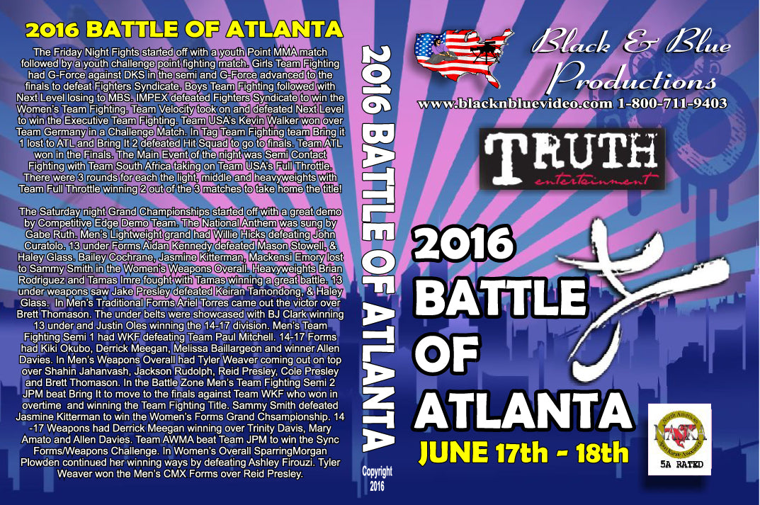 This is the official Battle of Atlanta tournament DVD. The 2016 Battle of Atlanta includes the entire Friday Night Fights and the entire Grand Championships on Saturday night. Features weapons and empty hand forms, sparring, demonstrations and much more!