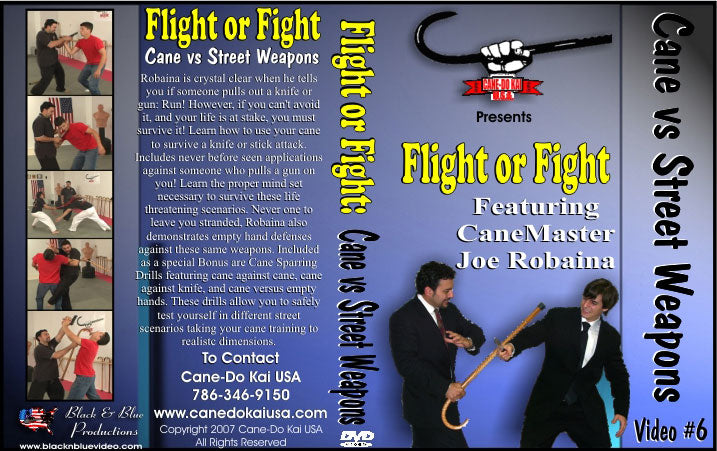 Cane Master Joe Robaina. Robaina is crystal clear when he tells you if someone pulls out a knife or gun: Run! However, if you can't avoid it, and your life is at stake, you must survive it! Learn how to use your cane to survive a knife or stick attack. Includes never before seen applications against someone who pulls a gun on you! Learn the proper mind set necessary to survive these life threatening scenarios. Never one to leave you stranded, Robaina also demonstrates empty hand defenses against these same weapons. Included as a special Bonus are Cane Sparring Drills featuring cane against cane, cane against knife, and cane versus empty hands. These drills allow you to safely test yourself in different street scenarios taking your cane training to realistc dimensions.