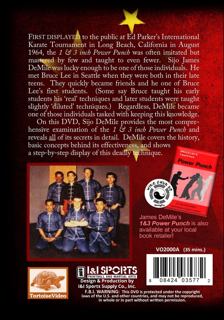 Bruce Lee's 1 & 3 inch power punch by James W DeMile (an original student of Bruce Lee). One of the most amazing & effective; yet least understood techniques in Bruce Lee's fighting arsenal was the 1 & 3 inch Power Punch. It allowed Bruce and all who mastered it; to deliver devastating power punches in close range combat! First displayed to the public at Ed Parker's International Karate Tournament in Long Beach; California in August 1964; the 1 & 3 inch Power Punch was often imitated but mastered by few and taught to even fewer. Sijo James DeMile was lucky enough to be one of those individuals. He met Bruce Lee in Seattle when they were both in their late teens and quickly became friends and one of his first students. (Some say Bruce taught his early students his 'real' techniques and later students were taught slightly 'diluted' techniques.) Regardless; DeMile became one of those individuals tasked with keeping this knowledge. On this DVD he provides the most comprehensive examination of the 1 & 3 inch Power Punch and reveals all of its secrets in detail. DeMile covers the history; basic concepts behind its effectiveness; and shows a step-by-step display of this deadly technique.