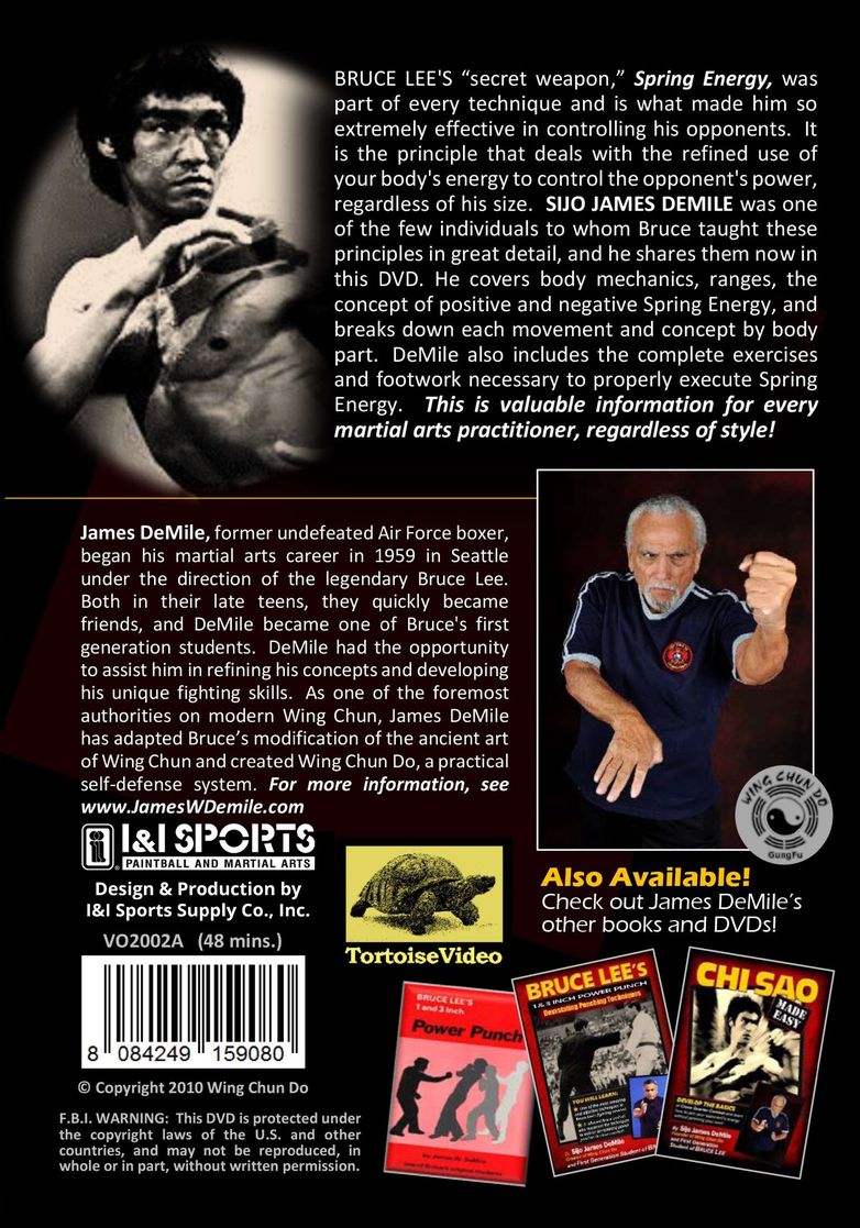 Bruce Lee's 'secret weapon' - Spring energy was part of every technique and is what made him so extremely effective in controlling his opponent. It is the principle that deals with the refined use of your body's energy to control the opponent's power regardless of his size. Sijo James DeMile was one of the few individuals whom Bruce taught these principles to in great detail; and he shares them now in this DVD. Valuable information for practitioners of any martial arts style! James DeMile; former Air Force boxer; began his martial arts career in 1959 in Seattle under the direction of Bruce Lee. Both in their late teens; they quickly became friends; and DeMile became one of Bruce's first generation students; DeMile had the opportunity to assist him in refining his concepts and developing his unique fighting skills. He is the founder of Wing Chun Do which is a modern application of the classical Wing Chun system.