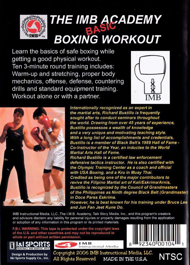 Noted Martial Arts Master, Richard Bustillo shares some of his 30+ years of experience in this first volume of his IMB Academy series of instructional DVD. In Volume One, he instructs on the basics of safe boxing while getting a good physical workout. Ten 3-minute round training sessions include: warm-up & stretching, proper body mechanics, offense, defense, countering drills and equipment training. Designed for workouts alone or with a partner. Sigung Bustillo, was one of Bruce Lee's original Jun Fan Jeet Kune Do students, a Golden Gloves boxer, Grandmaster in Filipino martial arts (eskrima, kali and arnis), Muay Thai specialist (Kru), certified law enforcement defensive tactics instructor, and member of the American Society of Law Enforcement Trainers.