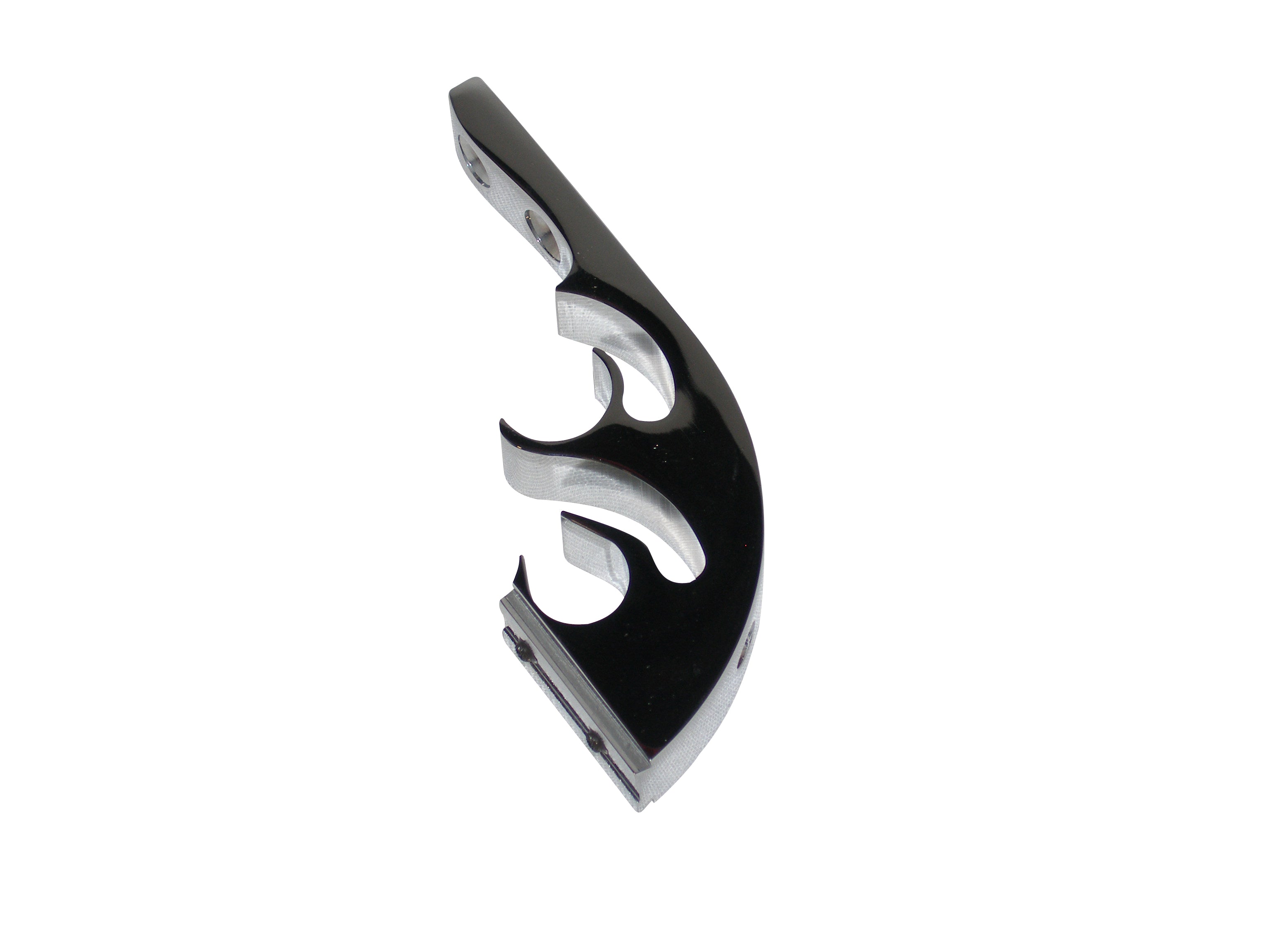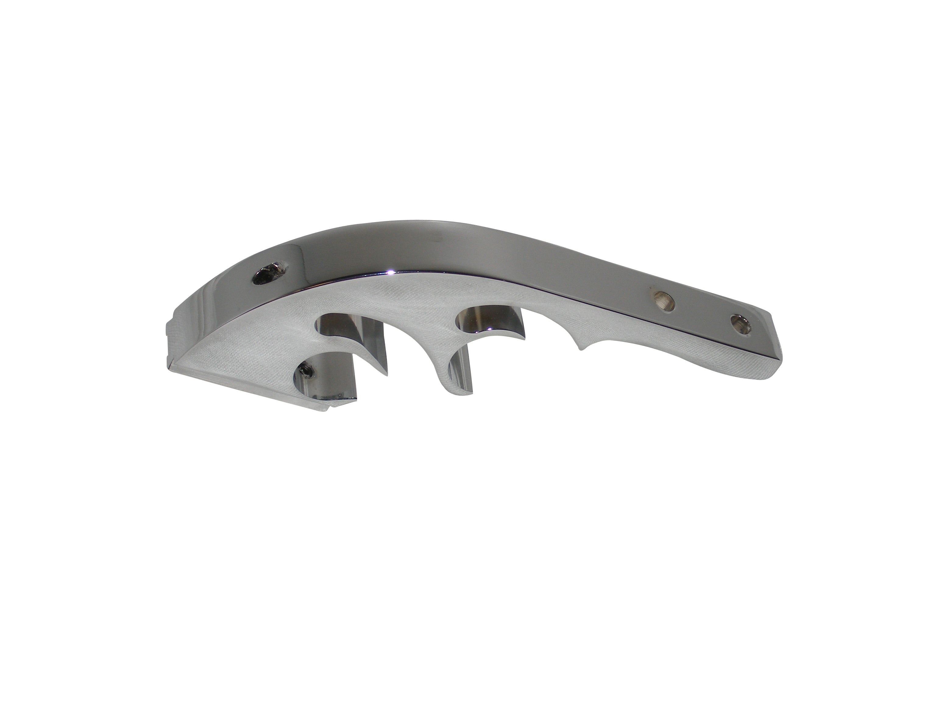 Genuine 3-D Flame Drop Forward. Will accept any standard rail mount On/Off Bottomline. Distinctive 'flame' design drop forward with standard 2-hole gun mounting configuration. 5" long, 2.5" drop. Lightweight aluminum with high gloss chrome finish.