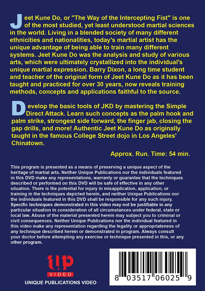 Barry Dixon helps you develop the basic tools of JKD by mastering the Simple Direct Attack. Learn such concepts as the palm hook, and palm strike, strongest side forward, the finger jab, closing the gap drills and more! Authentic Jeet Kune Do as originally taught in the famous College Street dojo in Los Angeles' Chinatown. 2001. 54 minutes.