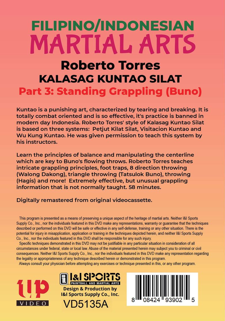 Learn the principles of balance and manipulating the centerline which are key to Buno's flowing throws. Roberto Torres teaches intricate grappling principles, foot traps, 8 direction throwing (Walong Dakong), triangle throwing (Tatsulok Buno), throwing (Hagis) and more! Extremely effective, but unusual grappling information that is not normally taught. 58 minutes.