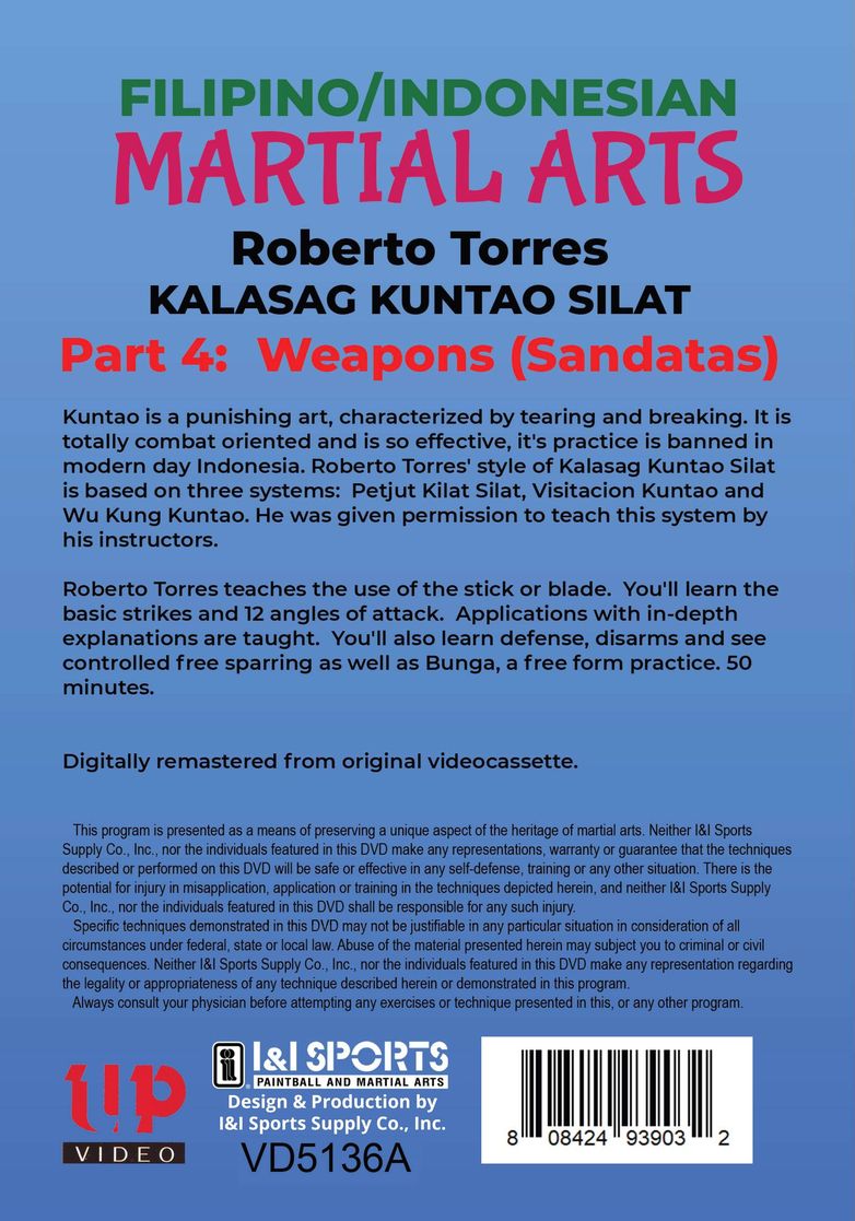 Kuntao is a punishing art, characterized by tearing and breaking. It is totally combat oriented and is so effective, it's practice is banned in modern day Indonesia. Roberto Torres' style of Kalasag Kuntao Silat is based on three systems: Petjut Kilat Silat, Visitacion Kuntao and Wu Kung Kuntao. He was given permission to teach this system by his instructors.