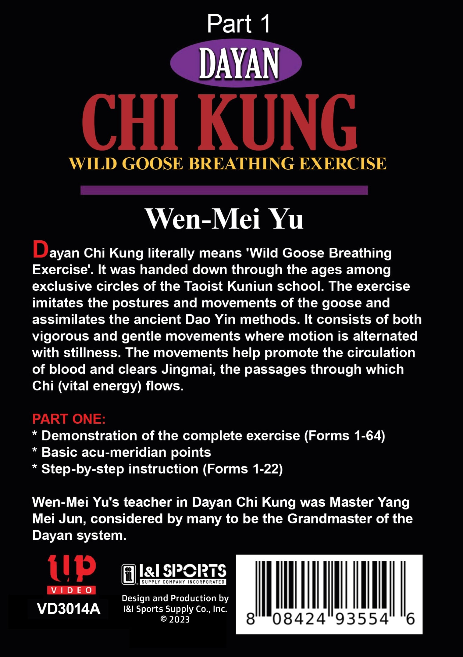 Dayan Chi Kung literally meaning Wild Goose Breathing Exercise, was handed down through the ages among exclusive circles of the Taoist Kunlun School. The exercise imitates the postures and movements of the goose and assimilates the ancient dao yin methods. It consists of both vigorous and gentle movements where motion is alternated with stillness. The movements help promote the circulation of blood and clears Jingmai, the passages through which Chi (vital energy) flows.
