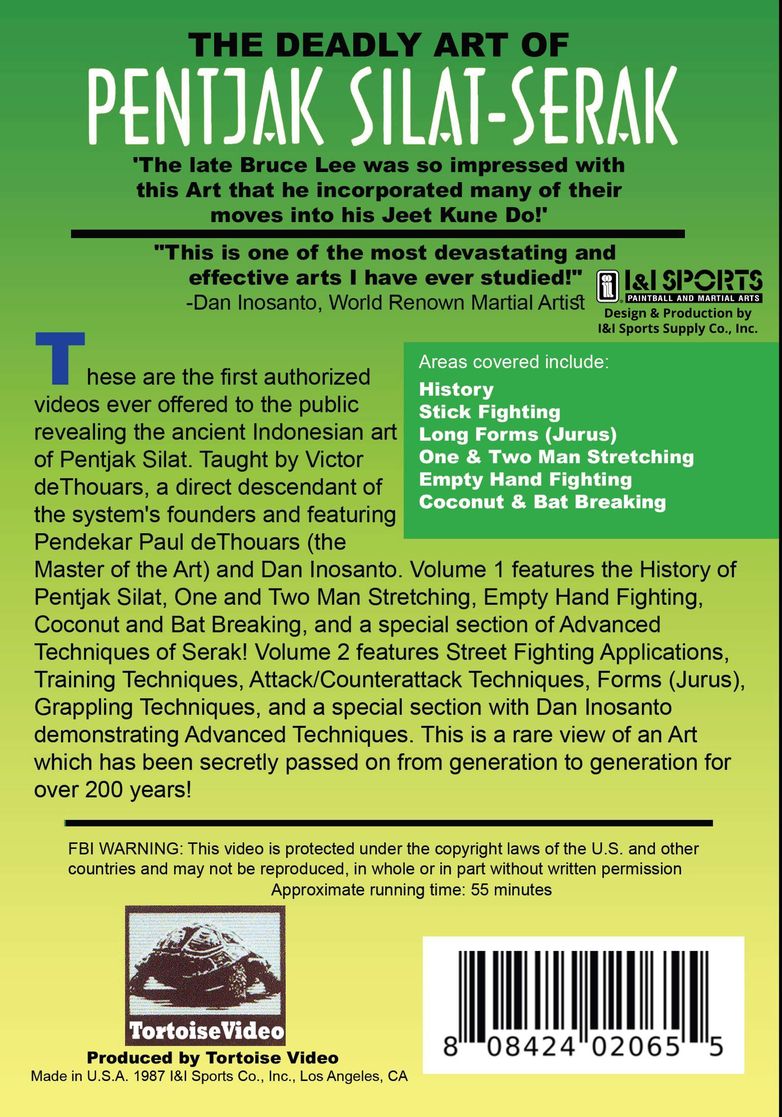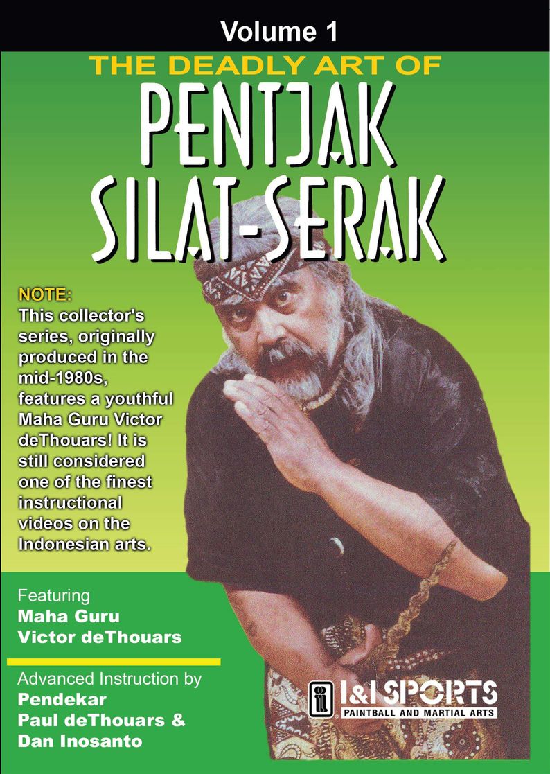 The first authorized DVD series offered to the public on this ancient art. Taught by Victor deThouars and Dan Inosanto. The history of Pentjak Silat, stretching, empty-hand fighting, stick fighting, coconut and bat breaking. Advanced techniques as well! 55 minutes. Note: this is one of the earliest DVDs displaying the influences of Pukulan Pentjak Silat Serak, Pencak Siliat and Silat Tongkat.