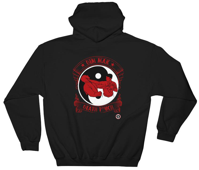 Original multi-color design inspired by the mysterious Chinese art of Dim Mak or 'Death Touch' on the back of a premium 50/50 cotton/polyester blend hooded black sweatshirt. Double-needle stitched with front pouch pocket and double-lined hood. Perfect casual wear for the martial artist! Adult sizes.
