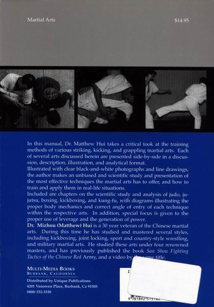 This volume provides an overview of the training and fighting methods of various striking; kicking; and grappling arts. Included are a scientific study and analysis of judo, jiu-jutsu, boxing, kickboxing, and kung-fu with diagrams illustrating the proper body mechanics and correct angle of entry of each technique within the respective arts. 7 X 10, 88 pages.