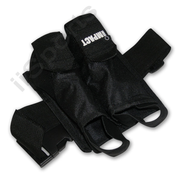 Deluxe double Paintball pod pouch holds two 100 or 140 round flip-top tubes (NOT INCLUDED) and comes with an adjustable web belt. Constructed of heavy black polyester material and features two separate pouches with velcro flaps and reinforced stitching throughout. Designed with 'elastic ejection straps' which pushes the tube out. BLACK.