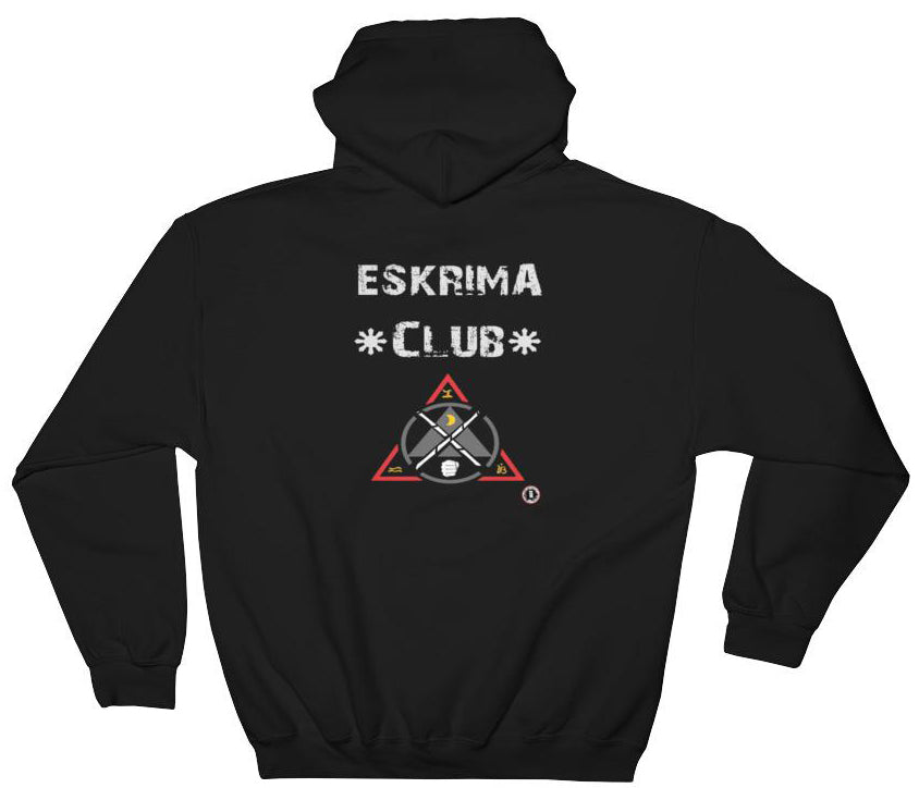 Multi-color design with white 'Eskrima Club' on the back of a premium 50/50 cotton/polyester blend hooded black sweatshirt. Double-needle stitched with front pouch pocket and double-lined hood. This hoodie is perfect casual wear for the martial artist! Adult sizes.