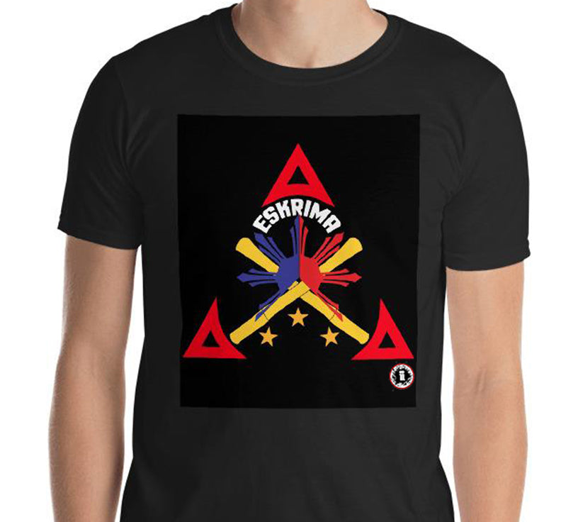 Stylized red, white, yellow and blue design printed on the front of a premium black cotton/poly T-Shirt. Great casual wear for the Escrima, Kali, Arnis practitioner! Adult sizes. Made in USA.
