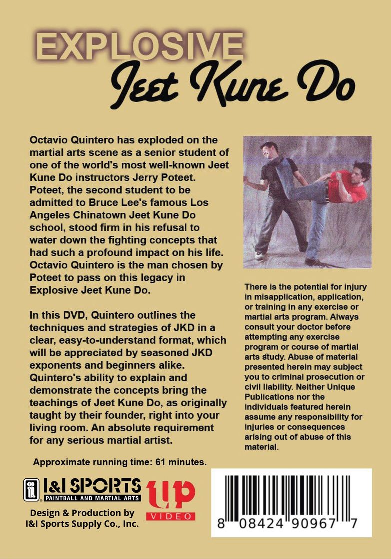 Octavio Quintero exploded on the martial arts scene as a senior student of one of the world's most well-known Jeet Kune Do instructors; Jerry Poteet. Poteet; the second student to be admitted to Bruce Lee's famous Los Angeles Chinatown Jeet Kune Do school; stood firm in his refusal to water down the fighting concepts that had such a profound impact on his life. In this DVD; Quintero outlines the techniques and strategies of JKD in a clear; easy-to-understand format; which will be appreciated by seasoned JKD exponents and beginners alike. Quintero's ability to explain and demonstrate the concepts bring the teachings of Jeet Kune Do; as originally taught by their founder; right into your living room! An absolute requirement for any serious martial artist. 54 minutes.