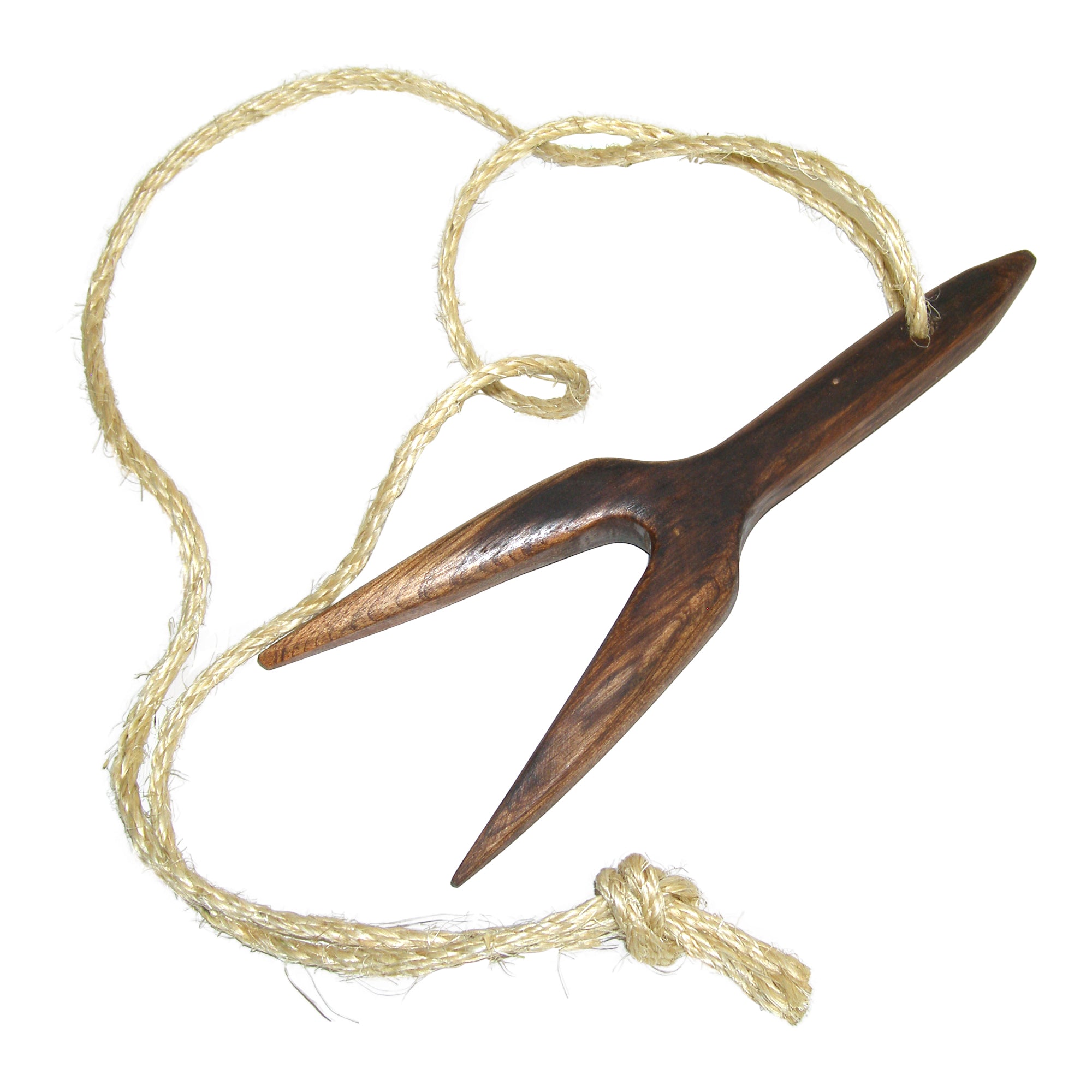 Handcrafted Mahagony hardwood practice double edged (eye) Maka Pahoa dagger. This traditional weapon was used for defensive clubbing, hand trapping and poking. Crafted from a solid piece of hardwood and features two 5 inch tapered prongs, a 6 inch handle and 6 ft rope lanyard. Overall: 11" x 4" x 1". Made in the USA.