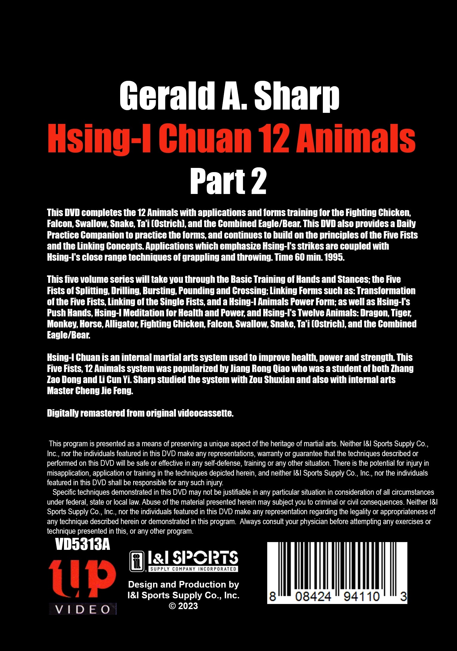 This DVD completes the 12 Animals with applications and forms training for the Fighting Chicken, Falcon, Swallow, Snake, Ta'i (Ostrich), and the Combined Eagle/Bear. This DVD also provides a Daily Practice Companion to practice the forms, and continues to build on the principles of the Five Fists and the Linking Concepts. Applications which emphasize Hsing-I's strikes are coupled with Hsing-I's close range techniques of grappling and throwing. Time 60 min. 1995.