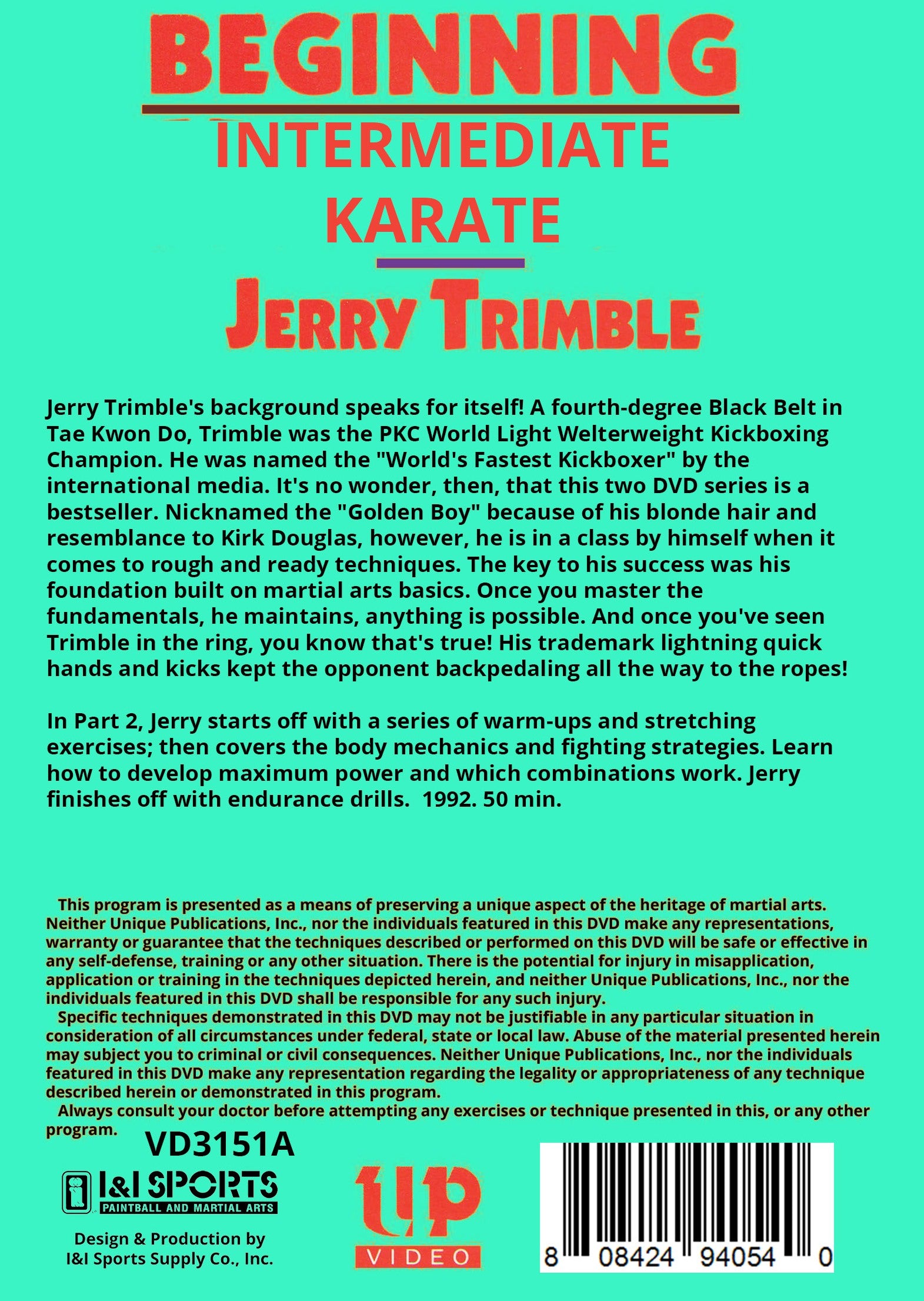 In Part 2, Jerry starts off with a series of warm-ups and stretching exercises; then covers the body mechanics and fighting strategies. Learn how to develop maximum power and which combinations work. Jerry finishes off with endurance drills. 1992. 50 min.