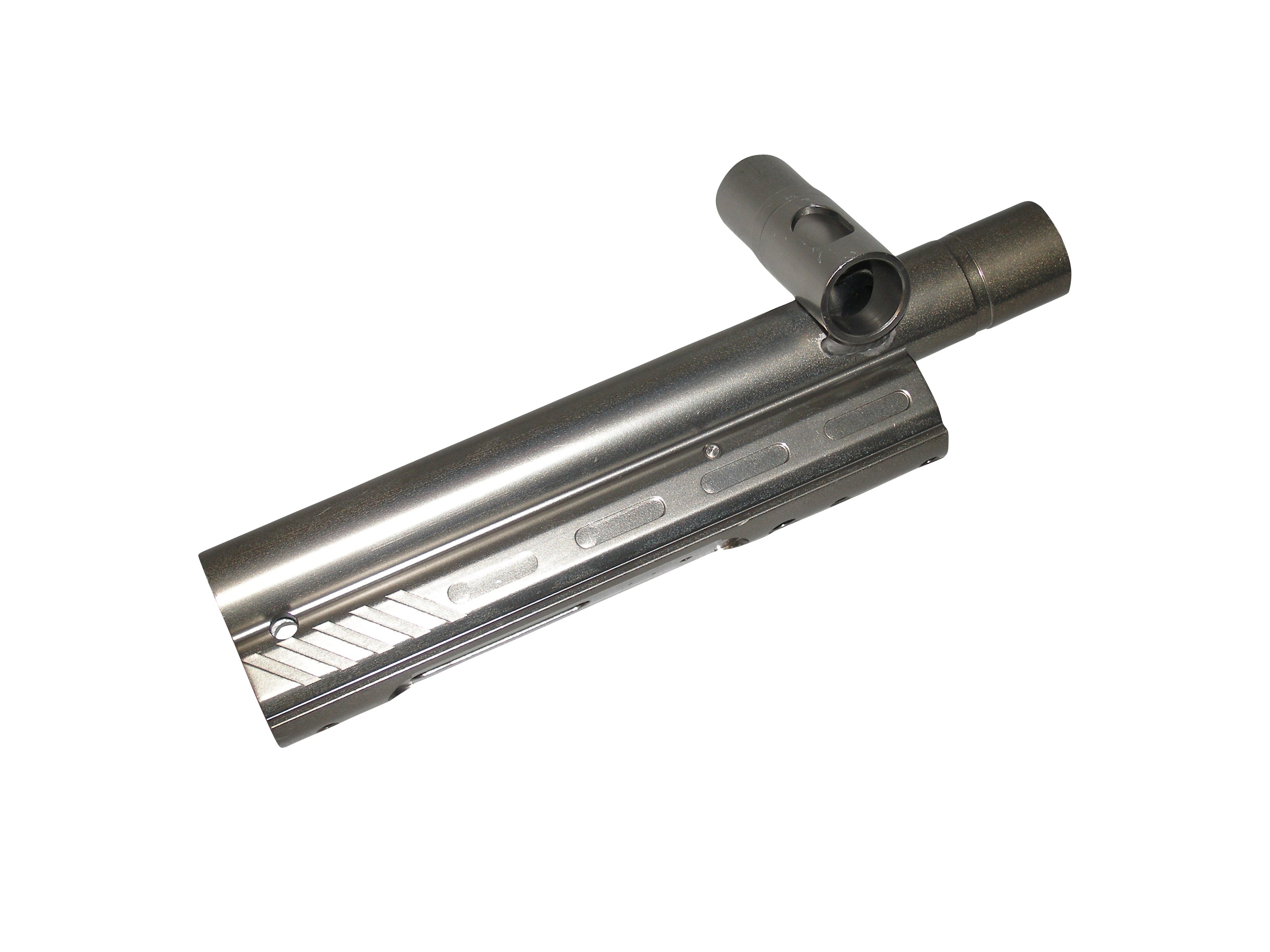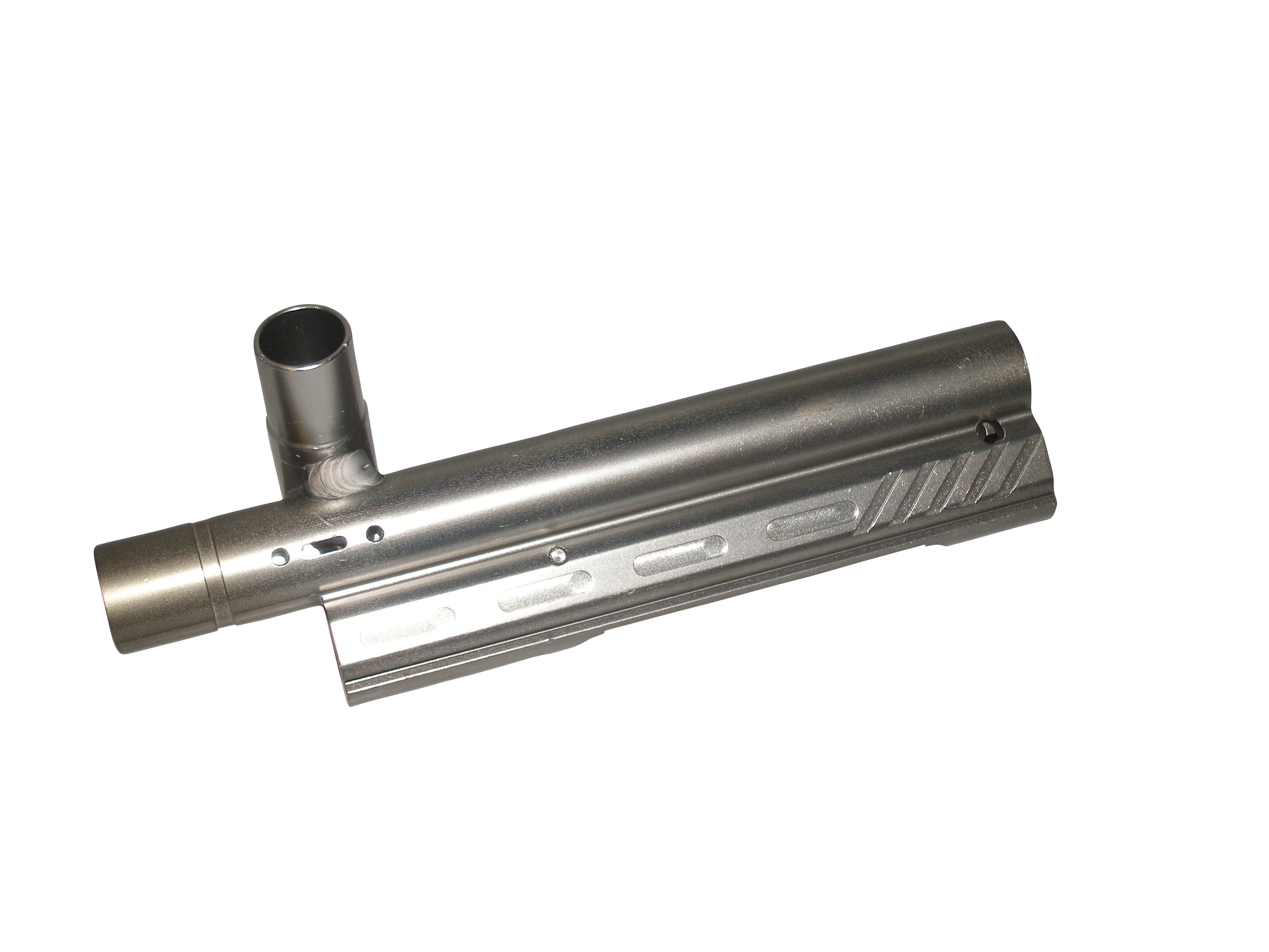 Genuine Kingman factory replacement body for the Spyder TL Plus and similar Paintball markers. Dust silver anodized aluminum crossfeed body (no feed plug). Rear cocking design completely drilled, tapped and ready to assemble. Fits 2000+ smaller hammer, bolt, etc. (NOT INCLUDED). Uses oval rear retaining pin which holds all internals in place. Internals NOT included. No valve, hammer, powertube, barrel or any other parts. Body Only. Measures 9 inch long. 1 inch wide. Threaded for Spyder compatible barrels. Build your own Spyder!