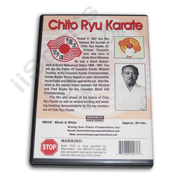 Filmed in 1967 this film features the founder of Chito Ryu Karate Dr. Chitose Tsuyoshi who was born in Akata Shuri Okinawa. He was a direct descendant of Bushi Matsumura Soken 1809 - 1901. You will see the Father Of Canadian Karate; Masami Tsuroka; at the Canadian Karate Championships. Karate Master Yamamoto is seen demonstrating bo katas and defense against the sai. Also featured is the classic match between Hal Henshal and Fred Boyko for the Canadian Black Belt Championships. This film also shows all the basics of Chito Ryu Karate as well as several exciting and amazing breaking demonstrations by the top practitioners of Chito Ryu Karate. Approx. 30 minutes B/W.