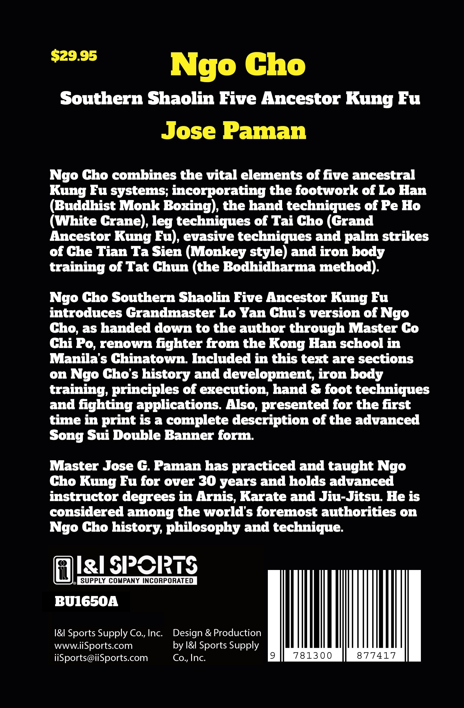 Ngo Cho Southern Shaolin Five Ancestor Kung Fu introduces Grandmaster Lo Yan Chu's version of Ngo Cho, as handed down to the author through Master Co Chi Po, renown fighter from the Kong Han school in Manila's Chinatown. Included in this text are sections on Ngo Cho's history and development, iron body training, principles of execution, hand & foot techniques and fighting applications. Also, presented for the first time in print is a complete description of the advanced Song Sui Double Banner form. 6 X 9; 182 pages; paperback.