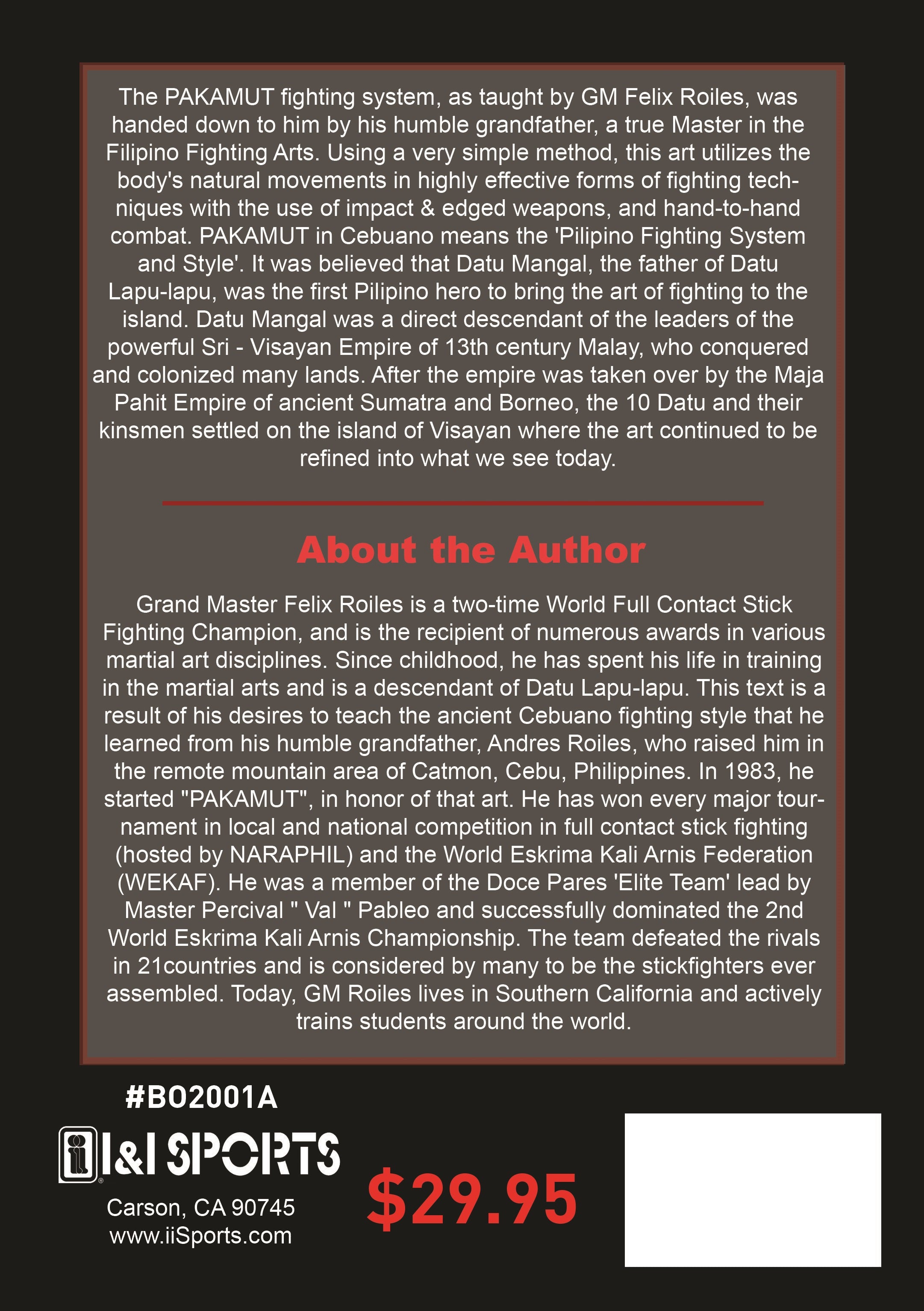 The PAKAMUT fighting system, as taught by GM Felix Roiles, was handed down to him by his humble grandfather, a true Master in the Filipino Fighting Arts. Using a very simple method, this art utilizes the body's natural movements in highly effective forms of fighting techniques with the use of impact & edged weapons, and hand-to-hand combat. PAKAMUT in Cebuano means the 'Pilipino Fighting System and Style'. It was believed that Datu Mangal, the father of Datu Lapu-lapu, was the first Pilipino hero to bring the art of fighting to the island. Datu Mangal was a direct descendant of the leaders of the powerful Sri - Visayan Empire of 13th century Malay, who conquered and colonized many lands. After the empire was taken over by the Maja Pahit Empire of ancient Sumatra and Borneo, the 10 Datu and their kinsmen settled on the island of Visayan where the art continued to be refined into what we see today. 6" x 9" 96 pages.
