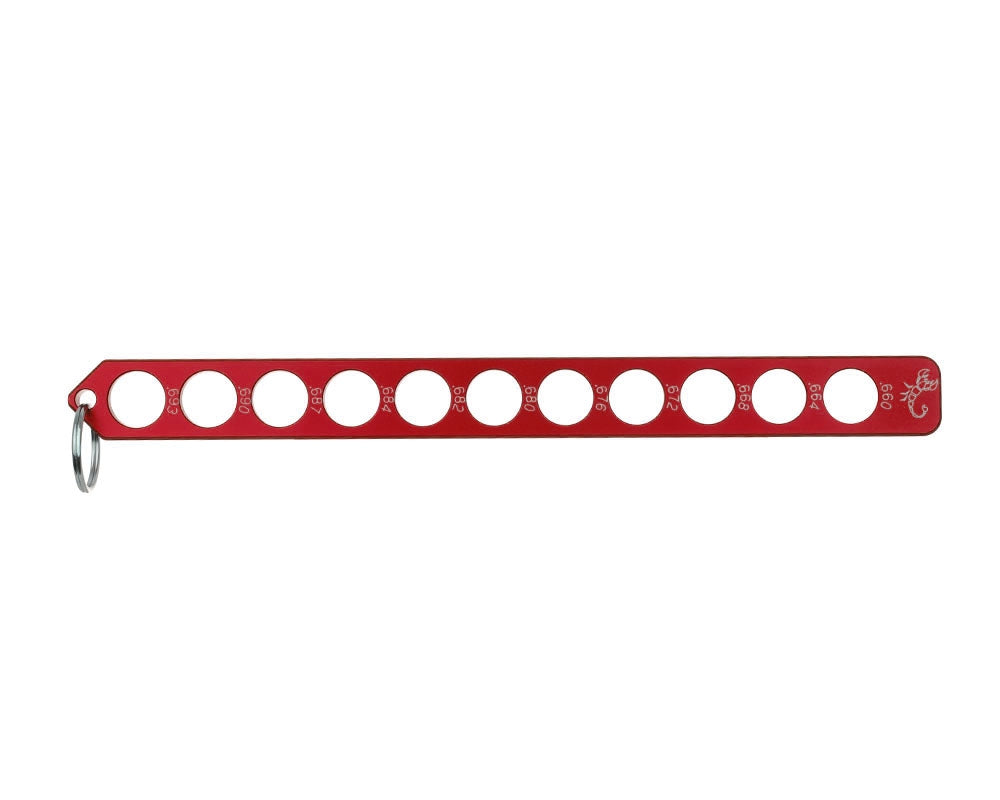Know the size of the Paintballs you're using! Instantly improve your accuracy by selecting the correct barrel bore for the paint you're using! This precision ball sizer features 11 bore sizing holes (.660", .668", .672", .676", .680", .682", .684", .687", .690", .693"). Constructed of aircraft aluminum, precision machined and deep penetration anodized in the USA. A "must have" tool for the serious player. To measure a paintball: Place the ball on one of the bore sizings holes. When you find the hole that the ball just squeaks through without any assistance; that is the size of the round. Test 5-6 different paintballs to average the size.