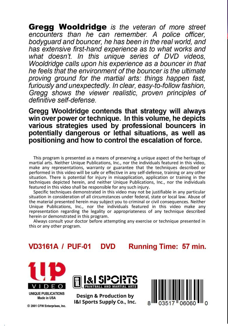 Gregg Wooldridge; veteran police officer; bouncer and professional bodyguard / executive protection specialist depicts various strategies used by professional bouncers in potentially dangerous or lethal situations; as well as positioning and how to control the escalation of force. He provides instruction in a clear, easy to follow fashion and shows the viewer realistic, proven principles of definitive self-defense. This is valuable information for anyone involved in personal security. 57 minutes. 2001