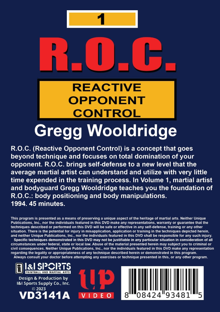 Reactive Opponent Control is a concept that goes beyond technique and focuses on total domination of your opponent. R.O.C. brings self-defense to a level that the average martial artist can understand and utilize with very little time expended in the training process. In this video, martial artist and bodyguard Gregg Wooldridge teaches you the foundation of R.O.C.: body positioning and body manipulations. Master Wooldridge has spent over 33 years dedicated to the Martial Arts and holds an 8th Degree Black Belt in Kang-Chuan-Do, a blend of Chinese, Korean and Japanese martial arts with a focus on practical self defense. 45 minutes.