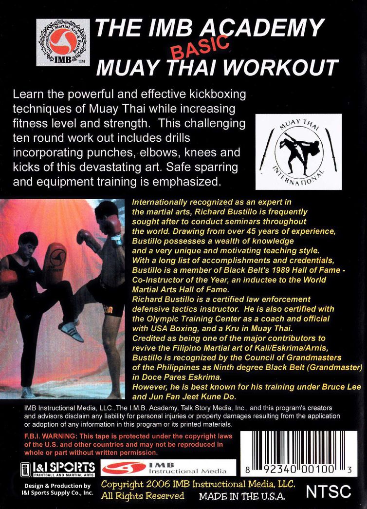 Noted Martial Arts Master, Richard Bustillo shares some of his 30+ years of experience in this volume of his IMB Academy series of instructional DVD. In volume 3 he instructs on the extremely effective combat art of Muay Thai. Areas covered include: warm-ups, conditioning drills, offensive & defensive arm and leg techniques and various fighting techniques. Designed for workouts alone or with a partner. Sigung Bustillo, was one of Bruce Lee's original Jun Fan Jeet Kune Do students, a Golden Gloves boxer, Grandmaster in Filipino martial arts (eskrima, kali and arnis), Muay Thai specialist (Kru), certified law enforcement defensive tactics instructor, and member of the American Society of Law Enforcement Trainers.