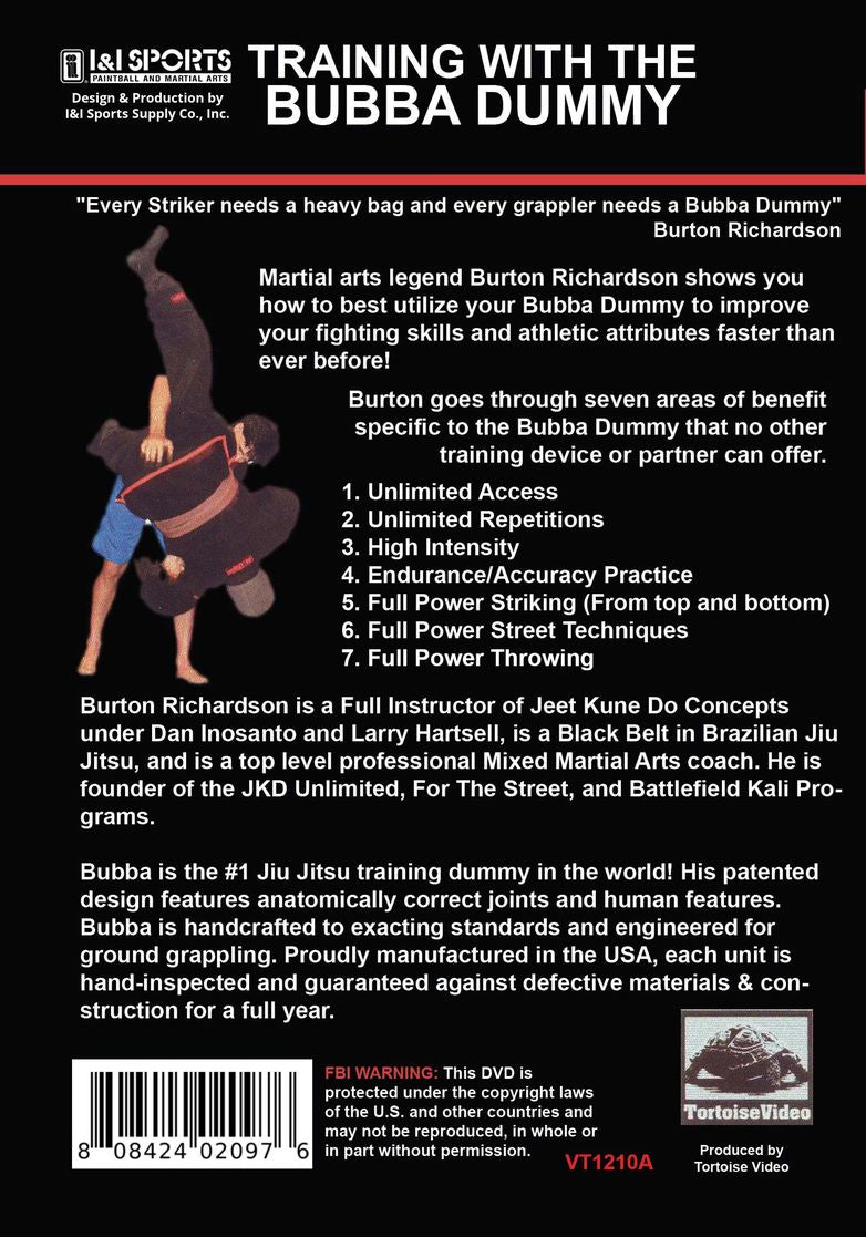 Martial arts legend Burton Richardson shows you how to best utilize your Bubba Dummy to improve your fighting skills and athletic attributes faster than ever before! Burton goes through the seven areas of benefit specific to the Bubba Dummy that no other training device or partner can offer. 1. Unlimited Access 2. Unlimited Repetitions 3. High Intensity 4. Endurance/Accuracy Practice 5. Full Power Striking (From top and bottom) 6. Full Power Street Techniques 7. Full Power Throwing Volume One covers care for your Bubba Dummy; and then goes into the unique benefits of training with the Bubba Dummy. Unlimited Access; Unlimited Repetitions; High Intensity Training; and Endurance/Accuracy training. Volume Two starts with Full Power Striking; the Full Power Street Techniques; and then Full Power Throwing. Burton then finishes with a sample workout; explaining the concepts of devising a workout so that you can create your own to fit your individual needs. Richardson explains each concept in depth with demonstrations which highlight advanced details for techniques such as the triangle; armbar; arm triangle; knee bar; north south choke; collar chokes; street techniques and more. He draws on his vast experience as a fight coach to give you more than just a DVD on using the Bubba Dummy; he also gives great insight into each technique to help you apply the moves against a live opponent. Burton ends the series with a sample training session where he actually shows a routine that he uses; while giving you the keys so you can create routines for yourself.