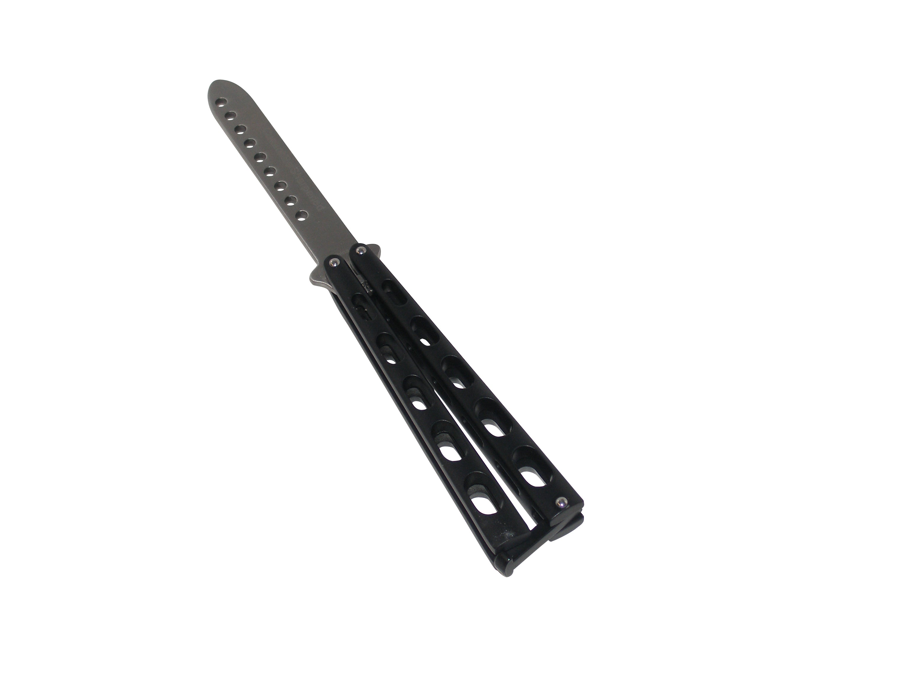 Ronin Gear's #220 Practice Butterfly knife features a 1.25" wide, rounded; perforated dull blade (blade cannot be sharpened!) that is ideal for safe training! High quality metal construction with optimal weight and balance. 5" closed, 4" blade. Legal under most state & local laws as it is a 'training replica' and cannot be made into functional knife. CANNOT BE SHARPENED! Black slotted handles.