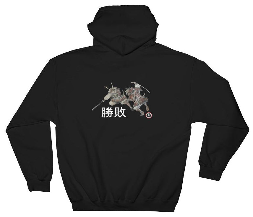 Designed by noted Artist - Hideo Sei! This original pen & ink artwork depicts a classic battle between the Samurai Sword and Naginata. Fine 10-color design with kanji is precision printed on the back of a premium 50/50 cotton/polyester blend hooded black sweatshirt. Double-needle stitched with front pouch pocket and double-lined hood. Perfect casual wear for the martial artist! Adult sizes.