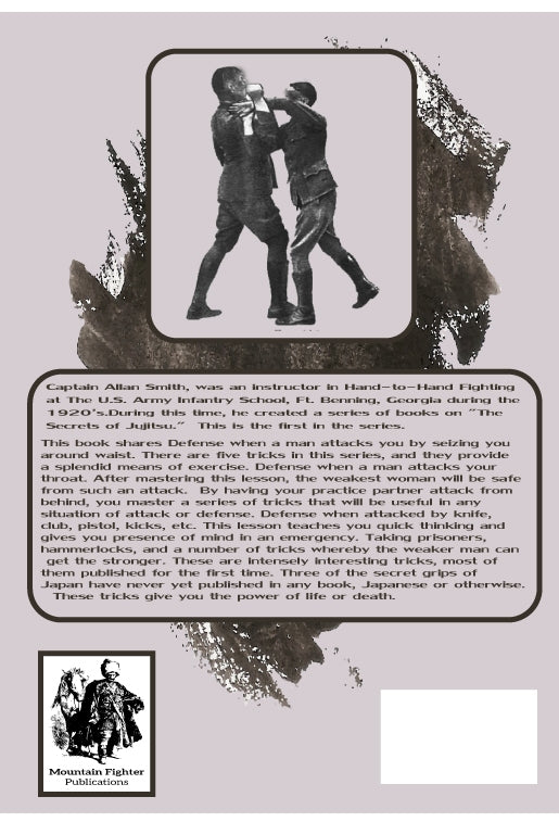 Captain Allan Smith, was an instructor in Hand-to-Hand Fighting at The U.S. Army Infantry School, Ft. Benning, Georgia during the 1920's. During this time, he created a series of books on The Secrets of Jujitsu. This is the first in the series. This book shares Defense when a man attacks you by seizing you around waist. There are five tricks in this series, and they provide a splendid means of exercise. Defense when a man attacks your throat. After mastering this lesson, the weakest woman will be safe from such an attack. By having your practice partner attack from behind, you master a series of tricks that will be useful in any situation of attack or defense. Defense when attacked by knife, club, pistol, kicks, etc. This lesson teaches you quick thinking and gives you presence of mind in an emergency. Taking prisoners, hammerlocks, and a number of tricks whereby the weaker man can get the stronger. These are intensely interesting tricks, most of them published for the first time. Three of the secret grips of Japan have never yet published in any book, Japanese or otherwise. These tricks give you the power of life or death. 7" x 10". 82 pages.