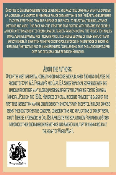 This is one of the most influential combat shooting books ever published and is a result of Capt. W.E. Fairbairn's and Capt. E.A. Sykes' practical experience with the handgun from their many close-quarters gunfights while working for the Shanghai Municipal Police in the 1930s. "Shooting to Live" describes the practical methods they developed and practiced. It has been adopted by numerous police organizations in the Far East and elsewhere. It covers everything from the purpose of the pistol, to selection, training, advance methods and more! This was the first time that fighting with firearms was clearly and explicitly disassociated from classical target/range shooting. The proven techniques displayed have spawned most modern pistol techniques because of their simplicity and effectiveness. It is written as instruction to police forces in the methods of shooting (reflexive/instinctive) and training (realistic/challenging) that the author developed over two decades of active service in Shanghai. 6" x 9". 125 pages.