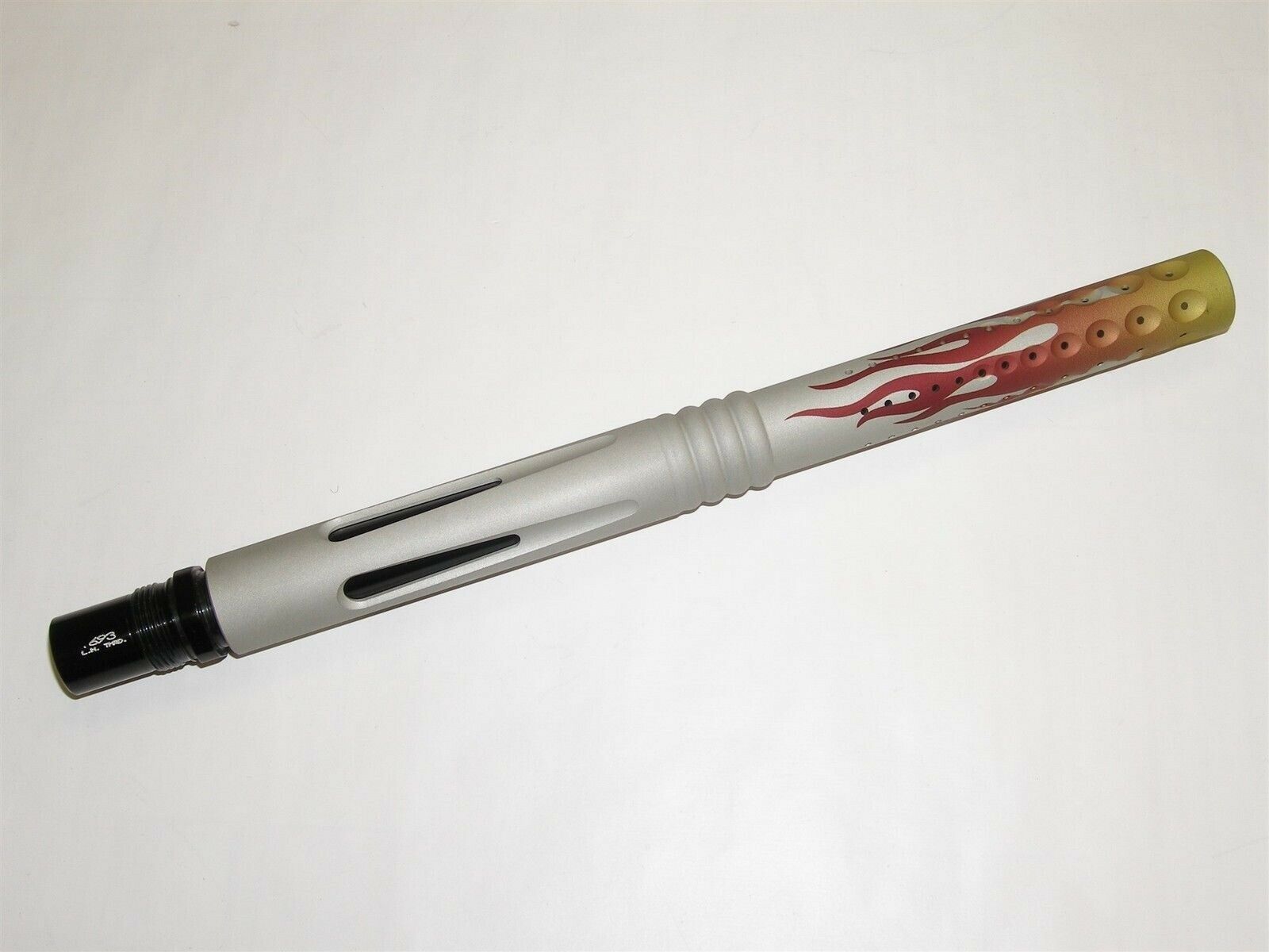 This is a genuine Sanchez Machine SM-III 2-piece barrel with .696" big bore insert. This barrel will allow you to shoot the worst Rec and swollen paintballs without barrel breaks! You'll still get amazing accuracy! Spyder threaded. Features a precision machined, micro polished and hand-finished 4.5" insert and a matching 11" barrel in flat gray with distinctive flame accents! 4" long straight porting provides maximum noise reduction and optimal gas dissipation. Perfect for times when your paint is less than perfect!