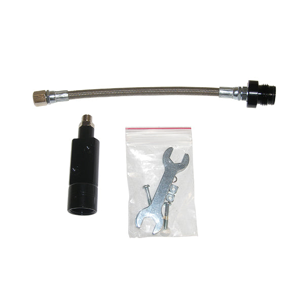Bottomline setup for the Spyder Compact 2000 and compatible vertical ASA markers. Set includes the male screw-in Adapter for the vertical ASA; Bottomline Tank Adapter with diagonal mounting holes and 8" Steel Braided Hose with fittings.