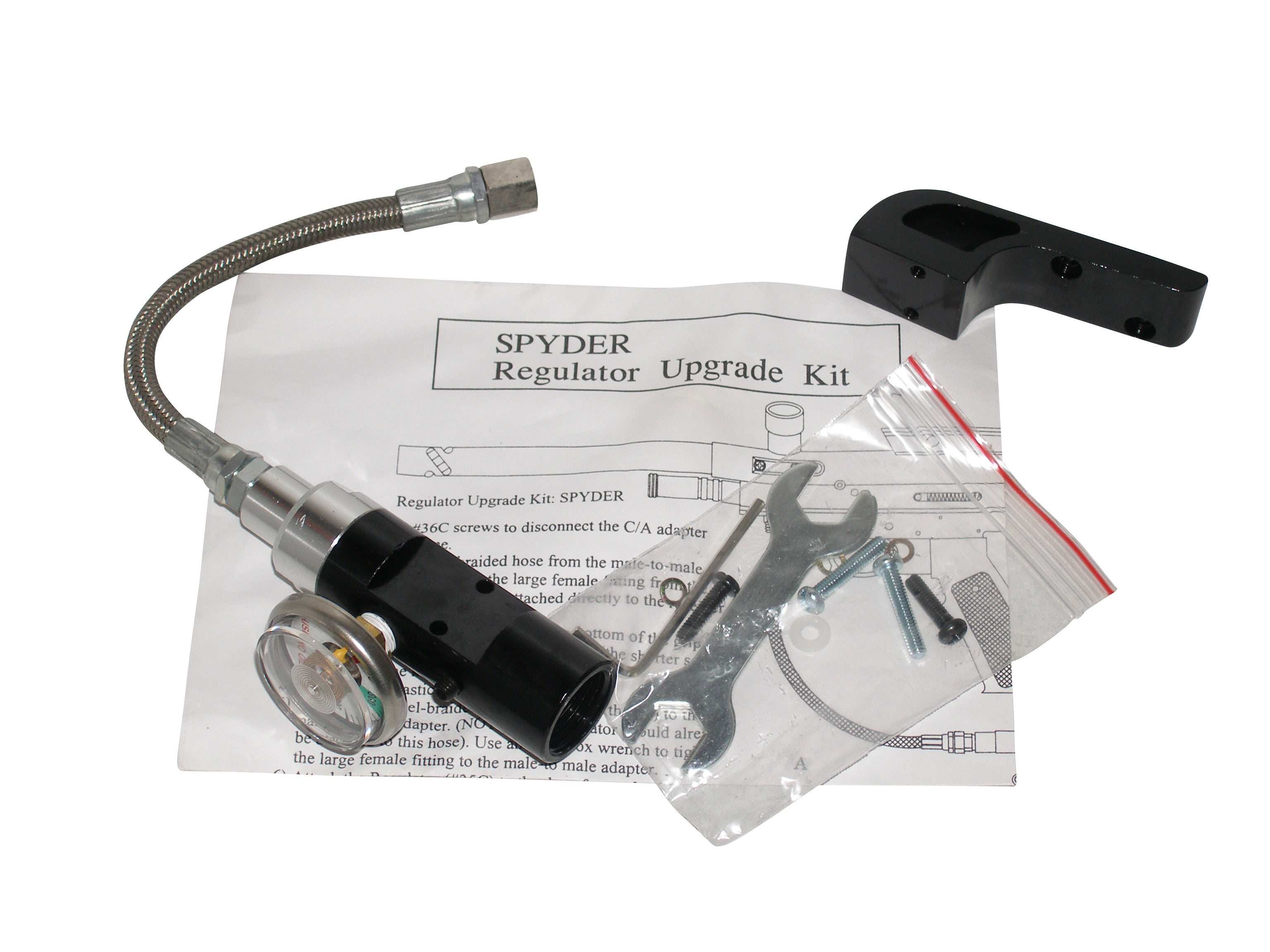 Complete replacement regulator setup for most Spyder Paintball markers (can also be used on other compatible markers!) Manufactured by Kingman. Includes the adjustable regulator with gauge, 6" steel braided hose with 1/8" NPT male threaded end, 2-hole drop forward (diagonal hole pattern), mounting screws and instructions. Vertical ASA adapter NOT included.