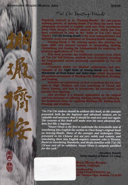 This book presents for the first time in one comprehensive volume a complete record of Yang style Tai Chi 'push hands' or 'sensing hands' techniques. Although most Tai Chi practitioners are currently familiar with three or four of the main push hands techniques; there are a variety of other 'hidden' sensing hands methods that previously have not been presented to the public. 7 X 10, 176 pages.